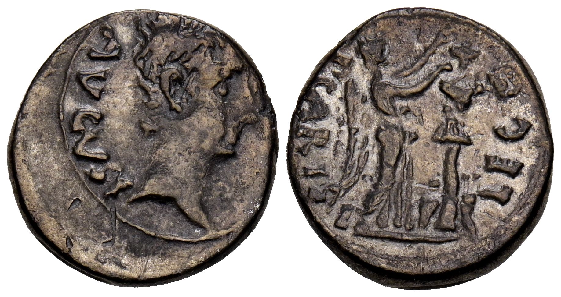 AUGUSTO. Quinario. (Ar. 1,76g/13mm). 25-23 a.C. Emérita Augusta. (RIC 1a). Anv: Cabeza de Augusto a derecha, detrás leyenda: AVGVSTVS. Rev: Victoria estante a derecha coronando trofeo, alrededor leyenda: P CARISI LEG. MBC.