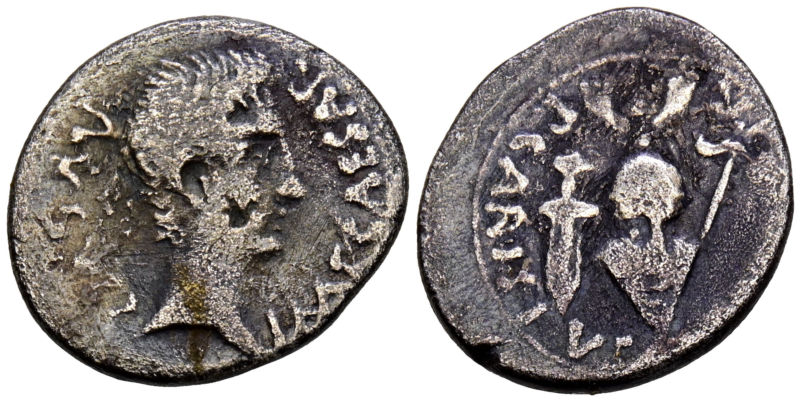 AUGUSTO. Denario. (Ar. 3,34g/19mm) 25-23 a.C. Emérita. (RIC 7a). Anv: Cabeza de Augusto a derecha, alrededor leyenda: IMP CAESAR AVGVST. Rev: Casco guerrero celtíbero, entre espada y hacha de dos filos, alrededor leyenda: P CARISIVS LEG PRO PR. BC+. Plata porosa.