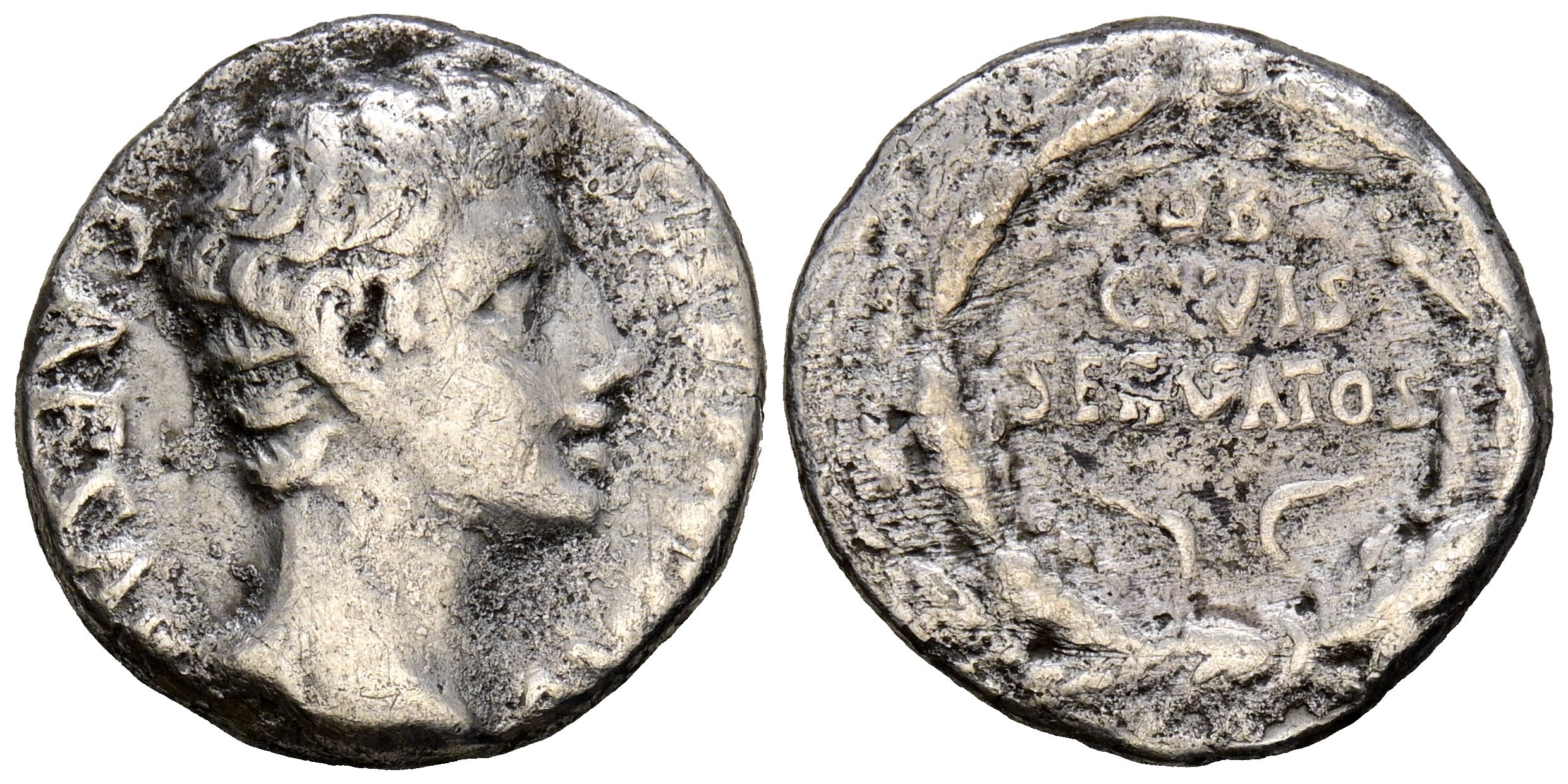 AUGUSTO. Denario. (Ar. 3.67g/17mm). 19-18 a.C. Posiblemente acuñado en Colonia Patricia. (RIC 77a). Anv: Cabeza de Augusto a la derecha, alrededor de la leyenda: AVGVSTVS CAESAR. Rev: Inscripción: OB CIVIS SERVATOS, dentro de una corona de laurel. BC+. Escaso.