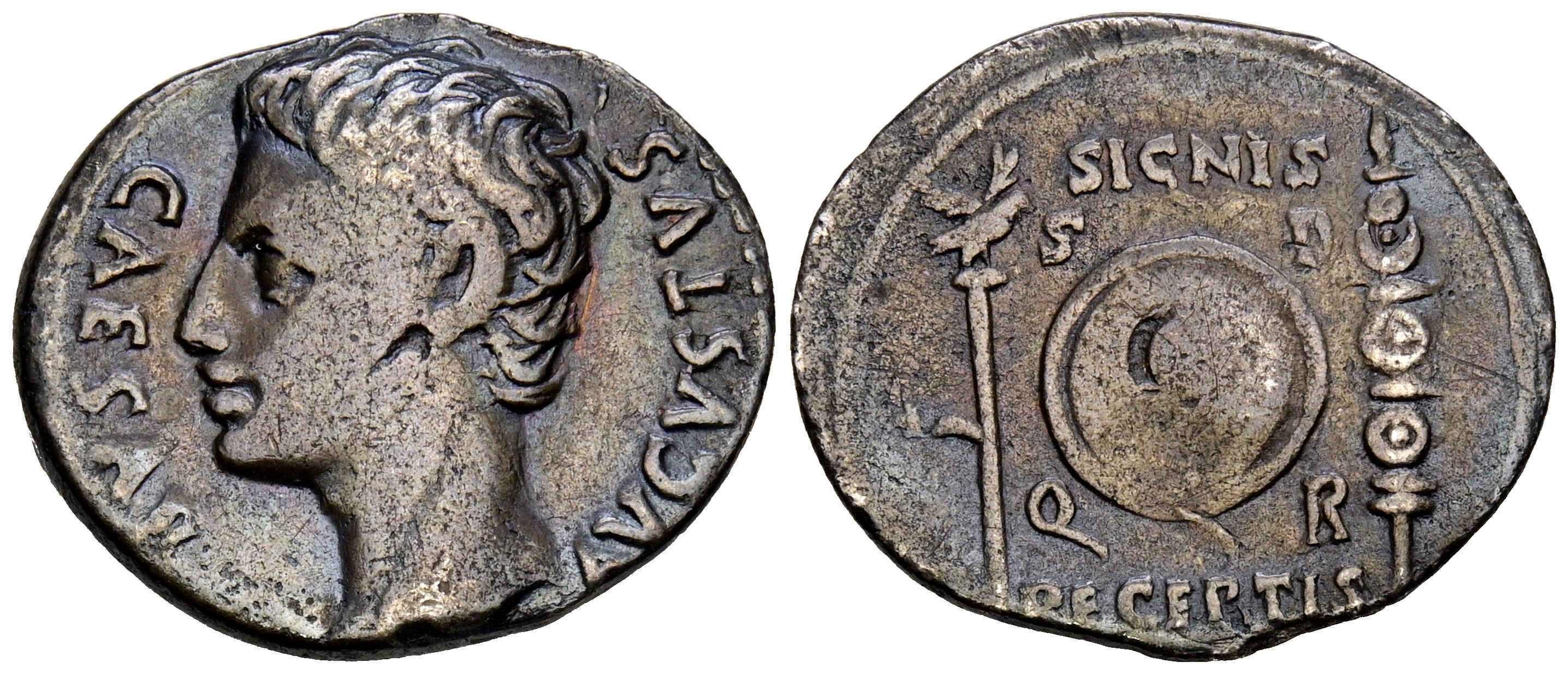 AUGUSTO. Denario. (Ar. 3,43g/20mm). 19 a.C. ¿Colonia Patricia?. (RIC 86b) Anv: Cabeza de Augusto a izquierda, alrededor leyenda: CAESAR AVGVSTVS. Rev: Escudo redondo con inscripción: CL·V. flanqueado por Aguila y Signum, alrededor: SPQR, entre leyenda: SIGNIS RECEPTIS. MBC.