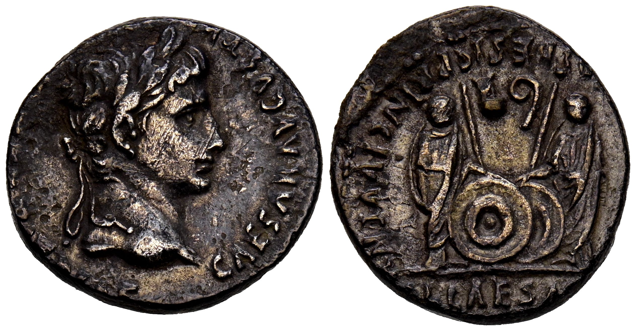 AUGUSTO. Denario. (Ar. 3,63g/18mm). 7-6 a.C. Roma. (RIC 207). Anv: Cabeza laureada de Augusto a derecha, alrededor leyenda: CAESAR AVGVSTVS DIVI F PATER PATRIAE. Rev: Cayo y Lucio estantes de frente, entre ellos escudo y lanzas, en campo símpulo y lítuo, en exergo: CL CAESARES, alrededor leyenda: AVGVSTI F COS DESIG PRINC IVVENT. MBC. Pátina oscura.