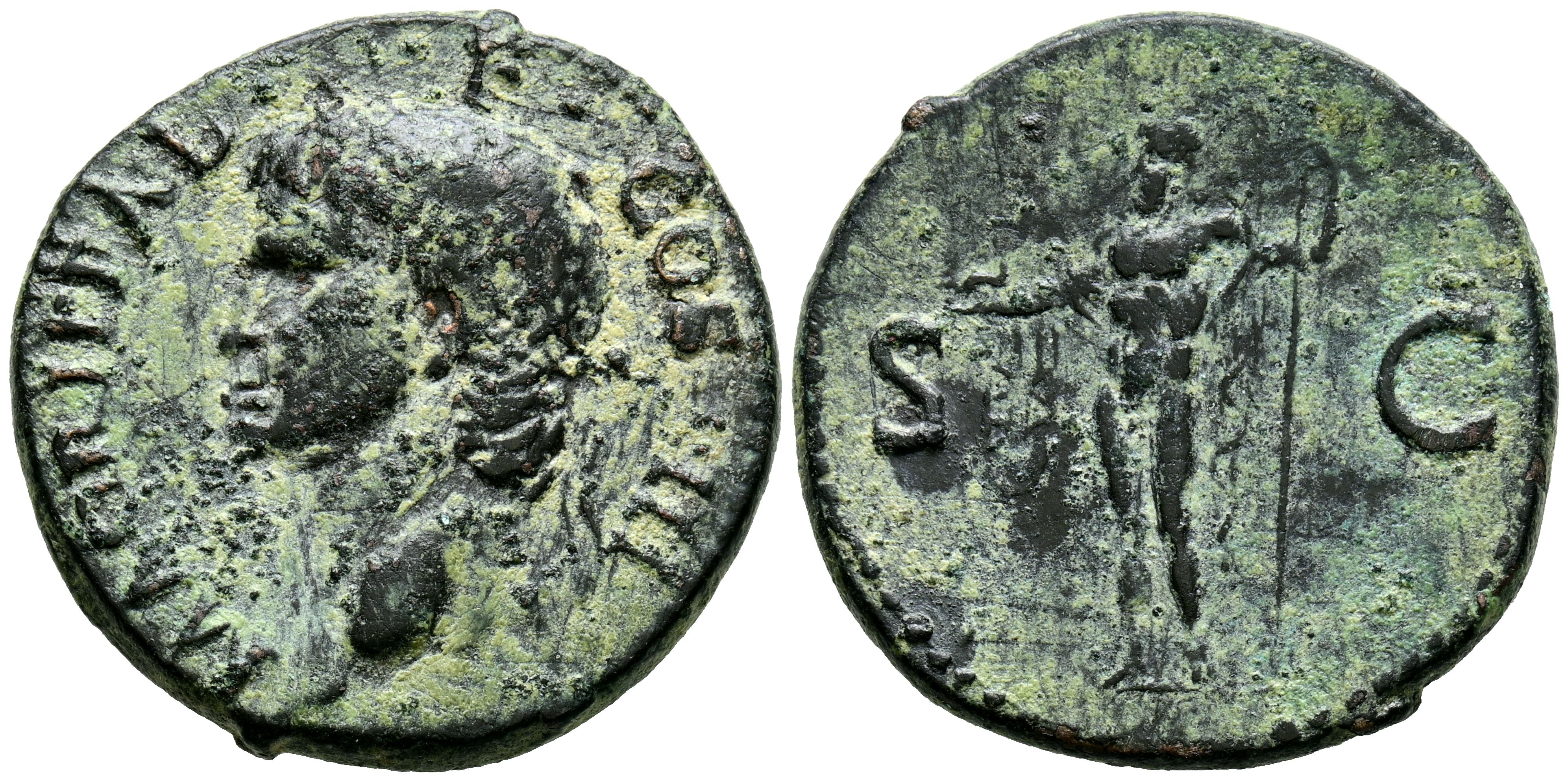 AGRIPA. As. (Ae. 11,63g/28mm). 37-41 d.C. Roma. (RIC 58). Anv: Busto laureado de Agripa a izquierda, alrededor leyenda: M AGRIPPA L F COS III. Rev: Neptuno estante a izquierda portando delfín y tridente, entre S-C. MBC.