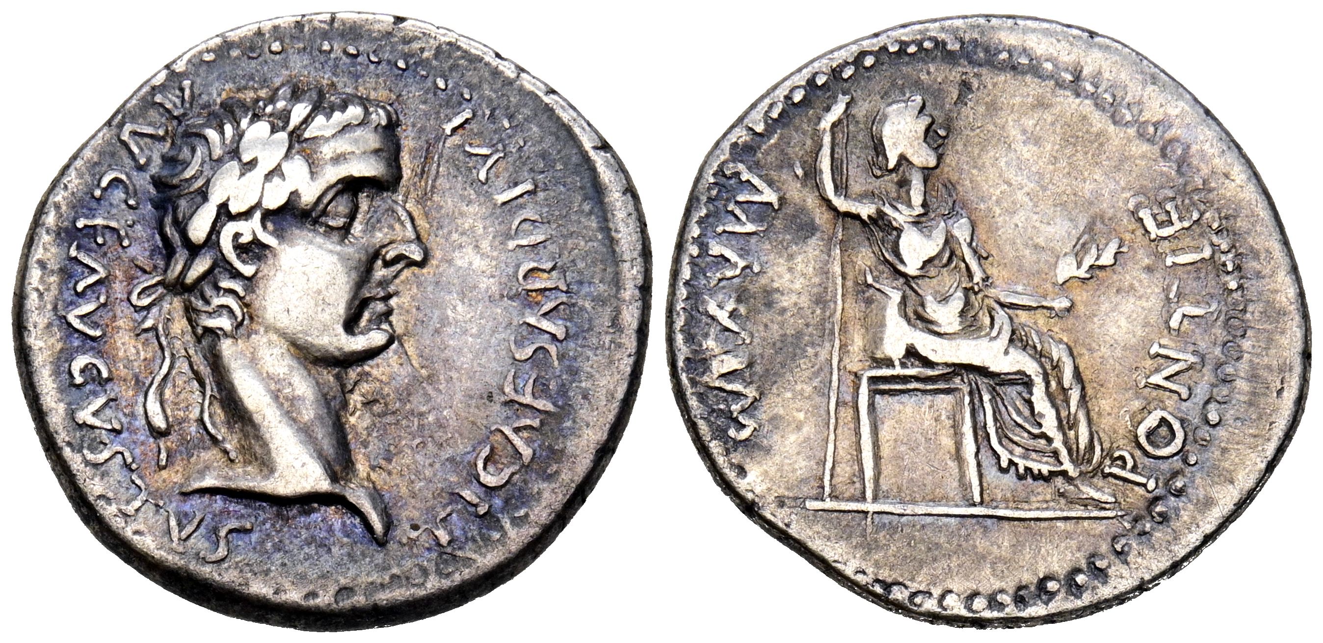 TIBERIO. Denario. (Ar. 3,58g/19mm). 14-37 d.C. Lugdunum. (RIC 30). Anv: Cabeza laureada de Tiberio a derecha, alrededor leyenda: TI CAESAR DIVI AVG AVGVSTVS. Rev: Livia sentada a derecha portando cetro y rama de olivo, alrededor leyenda: PONTIF MAXIM. MBC+.