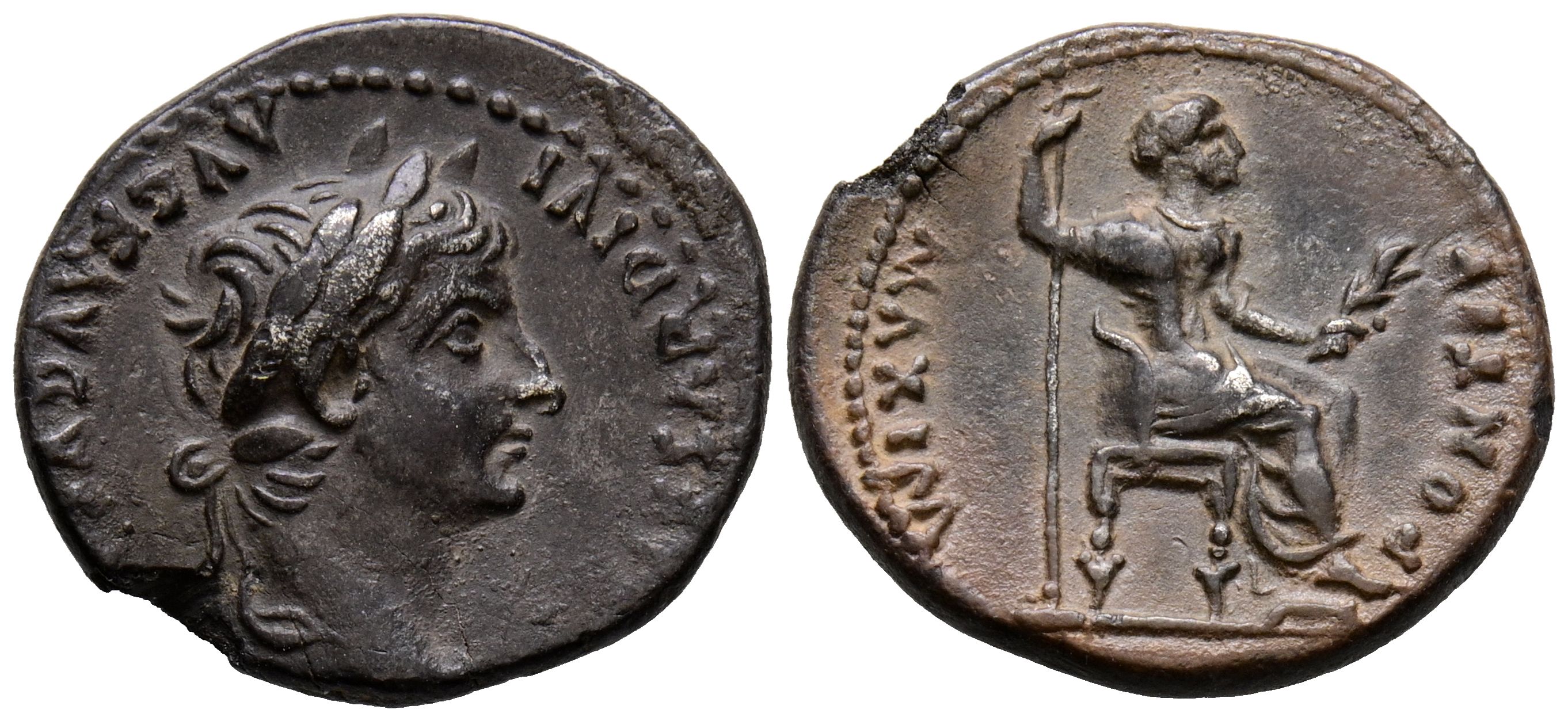 TIBERIO. Denario. (Ar. 3,50g/19mm). 14-37 d.C. Lugdunum. (RIC 30). Anv: Cabeza laureada de Tiberio a derecha portando cetro, alrededor leyenda: TI CAESAR DIVI AVGVSTVS. Rev: Livia sentada a derecha, alrededor leyenda: MAXIM PONTIF. MBC+. Cospel faltado. Pátina oscura.