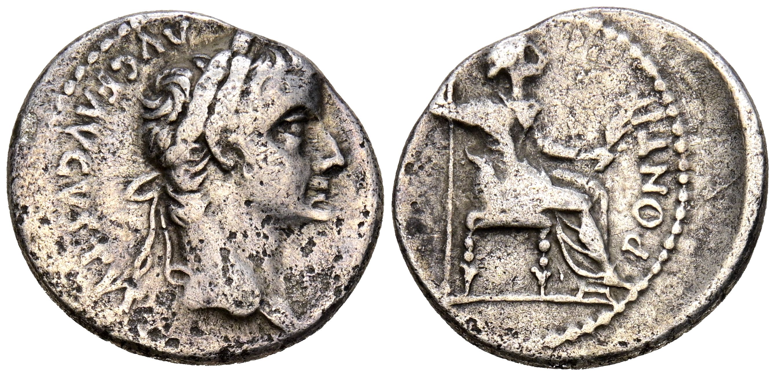 TIBERIO. Denario. (Ar. 3,60g/19mm). 14-37 d.C. Lugdunum. (RIC 30). Anv: Cabeza laureada de Tiberio a derecha portando cetro, alrededor leyenda: TI CAESAR DIVI AVGVSTVS. Rev: Livia sentada a derecha, alrededor leyenda: MAXIM PONTIF. MBC-. Acuñación desplazada.