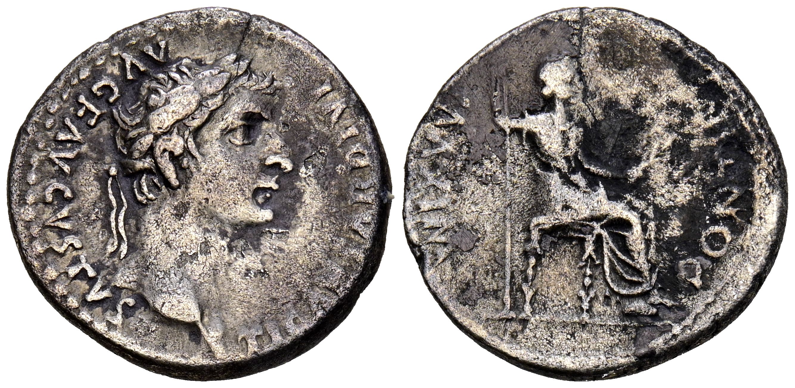 TIBERIO. Denario. (Ar. 3,61g/18mm). 14-37 d.C. Lugdunum. (RIC 30). Anv: Cabeza laureada de Tiberio a derecha portando cetro, alrededor leyenda: TI CAESAR DIVI AVGVSTVS. Rev: Livia sentada a derecha, alrededor leyenda: MAXIM PONTIF. BC+.