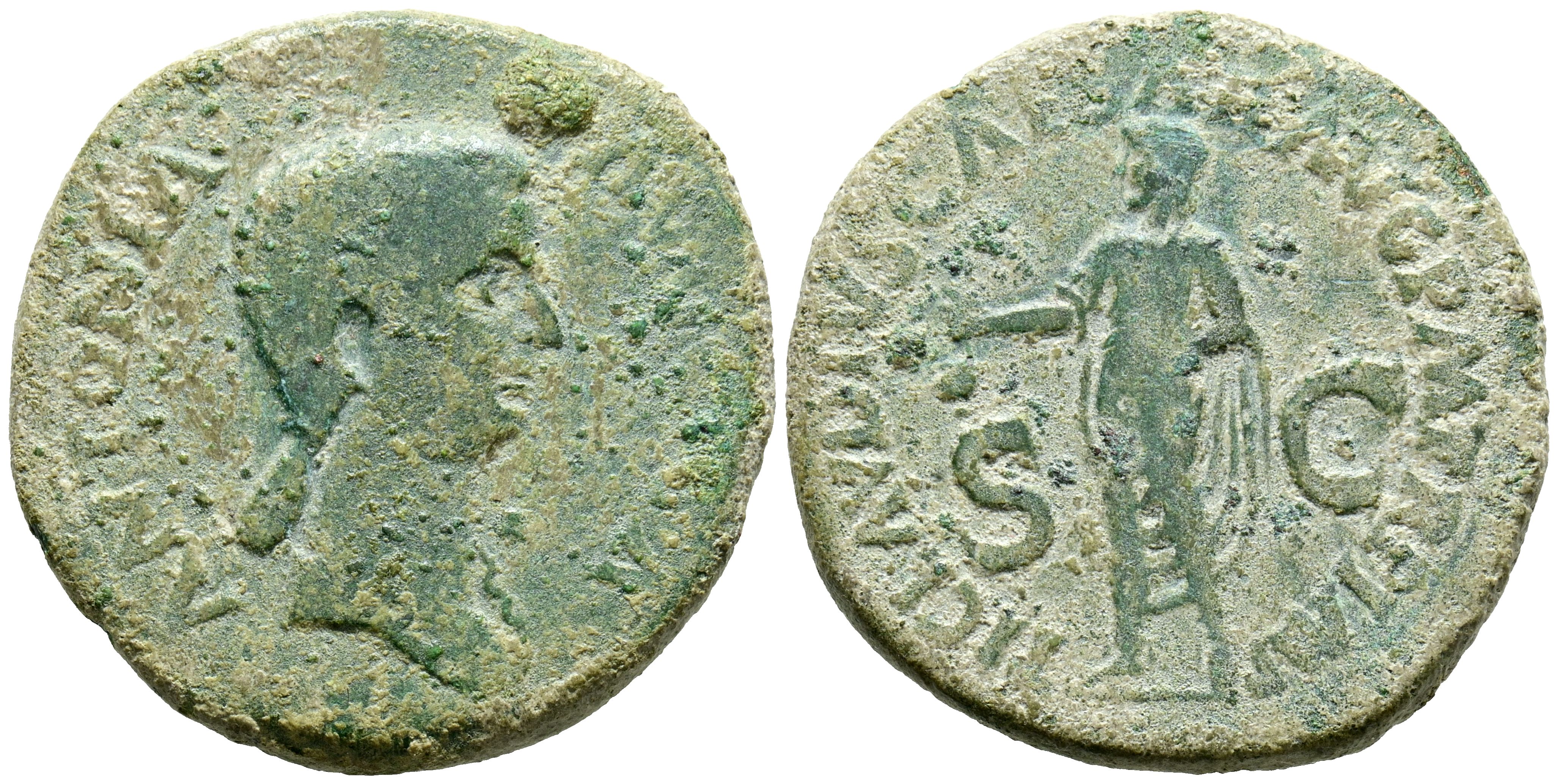 ANTONIA. Dupondio. (Ae. 12,13g/29mm). 41-42 d.C. Roma. (RIC 92). Anv: Busto descubierto a la derecha de Antonia, alrededor leyenda: ANTONIA AVGUST. Rev: Claudio velado y estante a izquierda con el símpulo, en campo: S-C, alrededor leyenda: TI CLAVDIVS CAESAR AVG P M TR P IMP. BC+/MBC-.