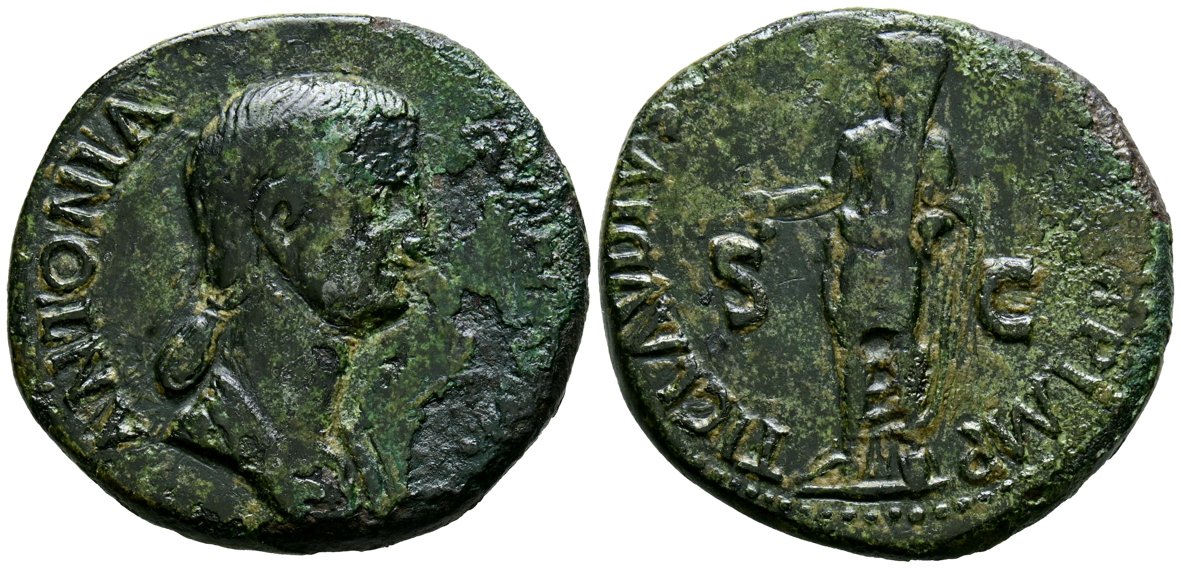 ANTONIA. As. (Ae. 11,46g/29mm). 41-42 d.C. Roma. (RIC 92). Anv: Busto drapeado con el pelo recogido a derecha de Antonia, alrededor leyenda: ANTONIA AVGVSTA. Rev: Claudio estante velado a izquierda portando símpulo, alrededor leyenda: TI CLAVDIVS CAESAR AVG P M TR P IMP P P. MBC-.