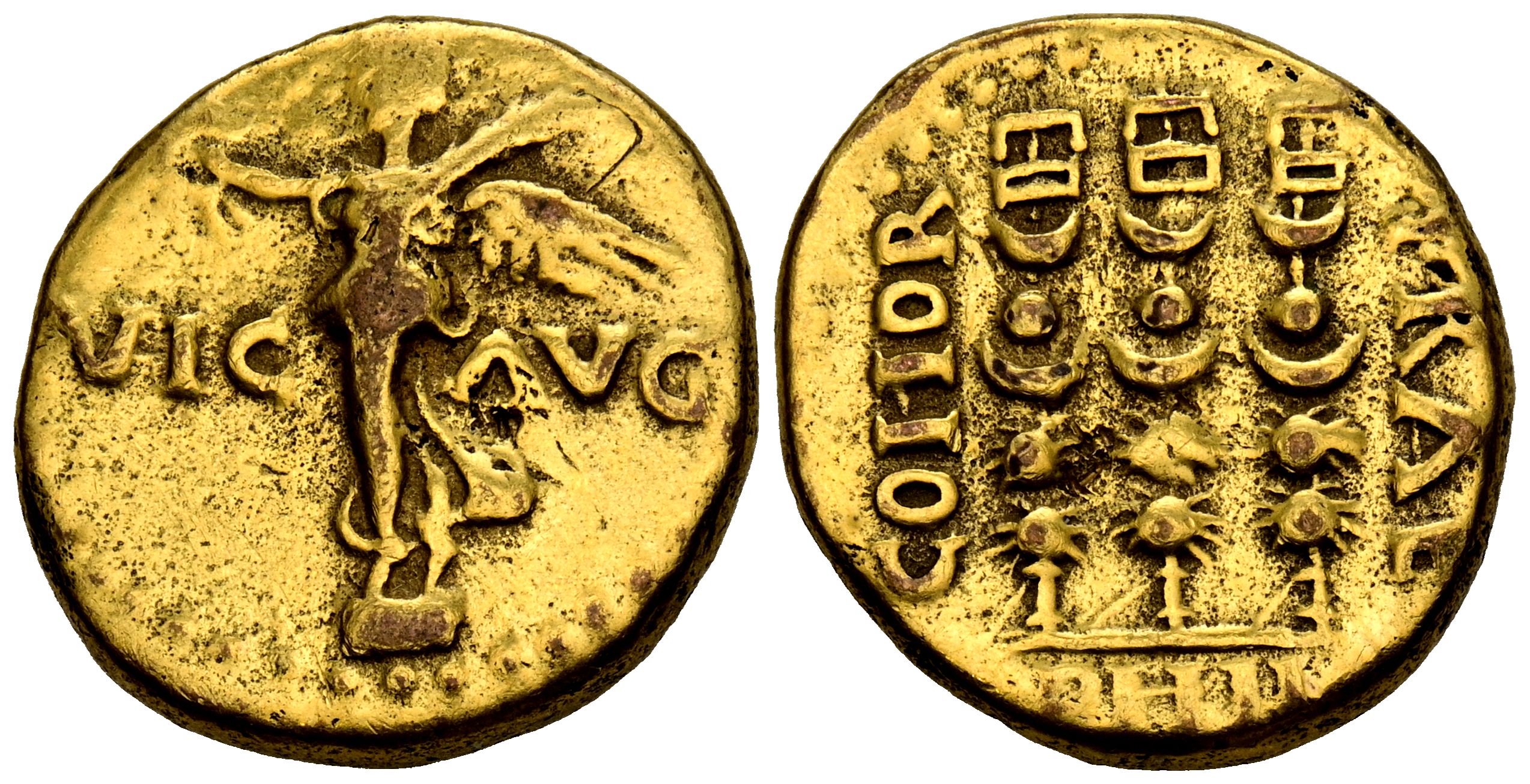 PSEUDO-AUTONOMA, tiempos de Claudio I o Nerón. Ae19. (Ae. 4,12g/19mm). 41-68 d.C. Macedoia, Philippi. (RPC 1651; SNG Copenhagen 305). Anv: Victoria estante sobre base a izquierda portando corona de laurel, entre: VIC AVG. Rev: Tres estandarte, entre: COHOR-PRAE, en exergo: PHIL. MBC. Sobredorado.