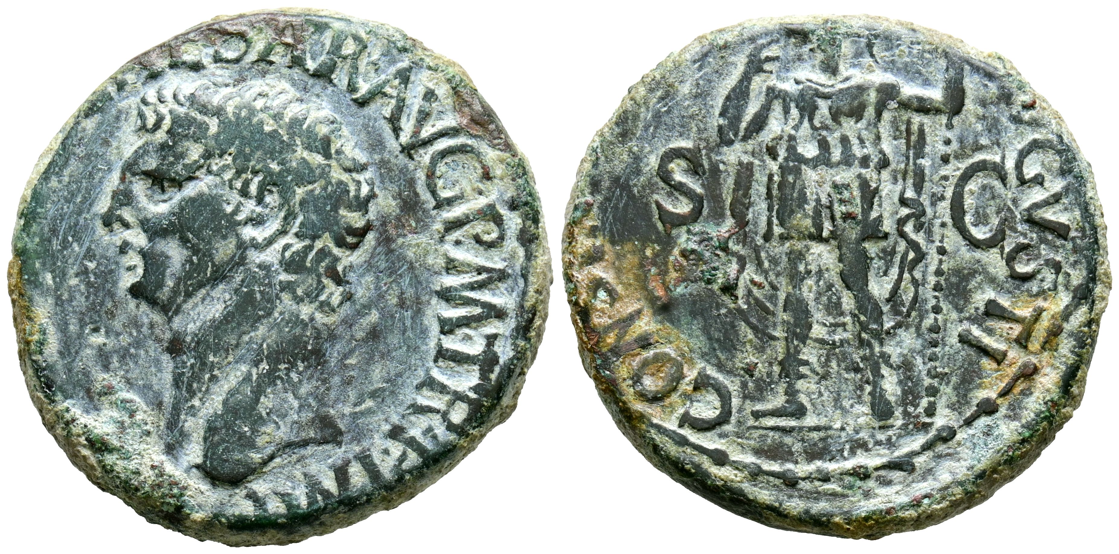 CLAUDIO I. As. (Ae. 11,19g/26mm). 41-50 d.C. Roma. (RIC 95). Anv: Busto de Claudio I a izquierda, alrededor leyenda: TI CLAVDIVS CAESAR AVG P M TR P IMP. Rev: Constantia con casco y atuendo militar estante a izquierda, portando lanza, S-C en el campo, alrededor leyenda: CONSTANTIAE AVGVSTI. MBC.