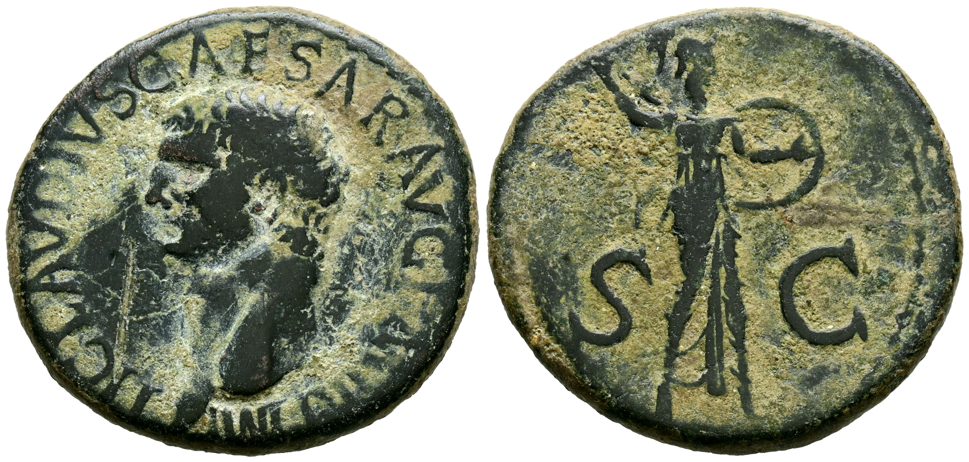 CLAUDIO I. As. (Ae. 10,12g/28mm). 41-50 d.C. Roma. (RIC 100). Anv: Cabeza de Claudio I a izquierda, alrededor leyenda: TI CLAVDIVS CAESAR AVG P M TR P IMP. Rev: Minerva avanzando a derecha portando lanza y escudo, en campo S-C. MBC.