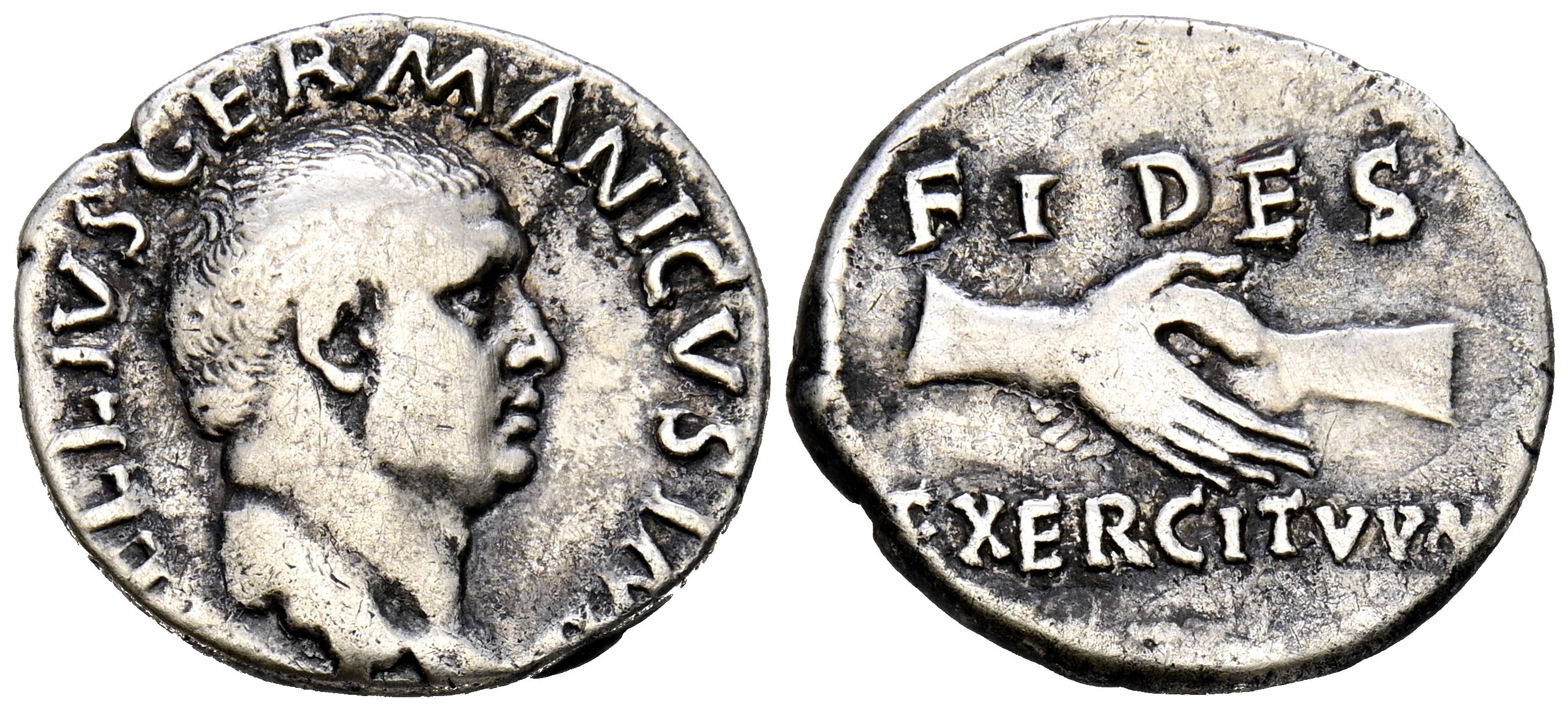 VITELIO. Denario. (Ar. 3,17g/19mm). 69 d.C. Roma. (RIC 67). Anv: Cabeza de Vitelio a derecha, alrededor leyenda: A VITELLIVS GERMANICVS IMP. Rev: Manos entrelazadas, alrededor leyenda: FIDES EXERCITVVM. MBC. Escaso.