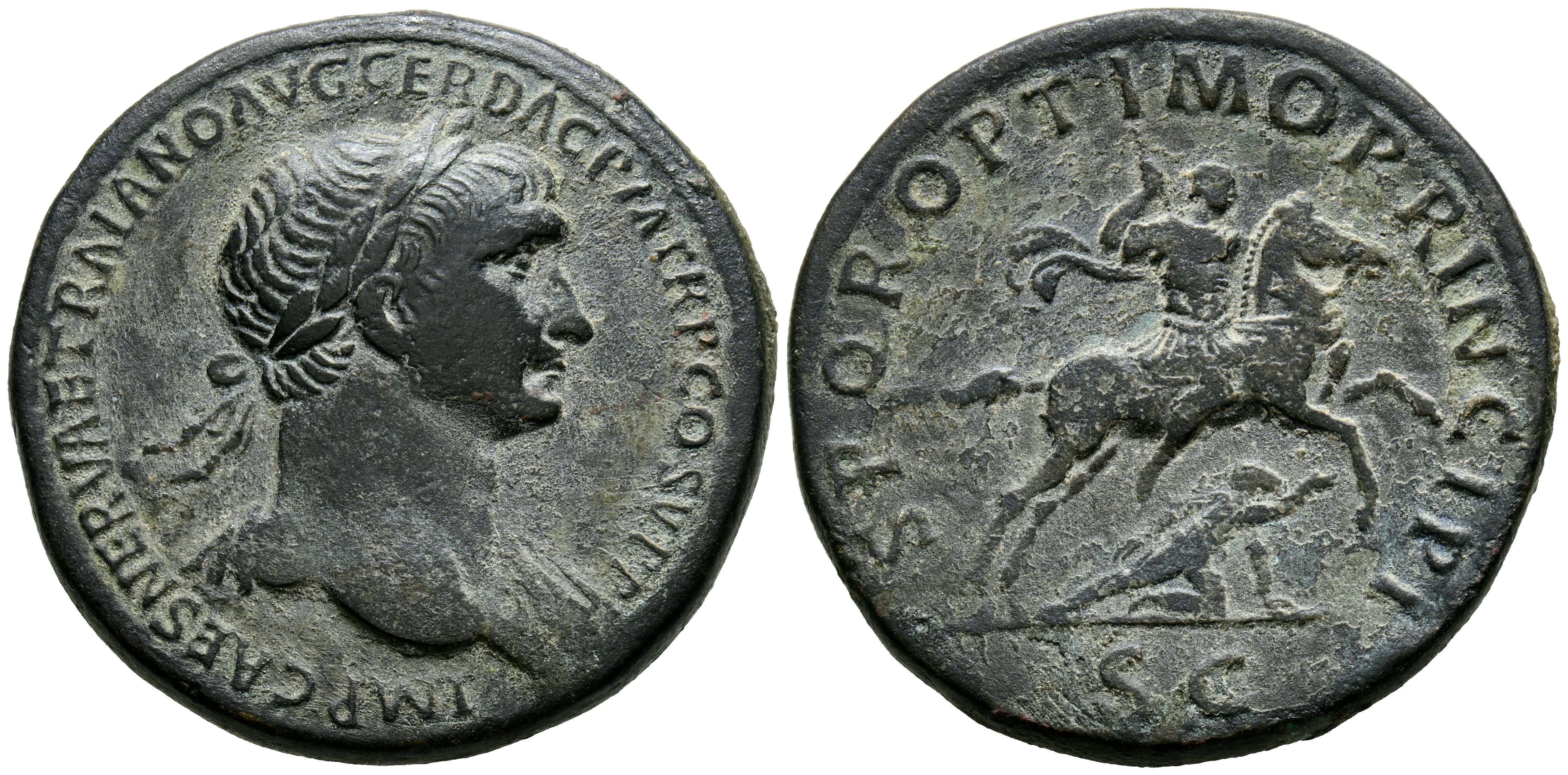 TRAJANO. Sestercio. (Ae. 23,88g/33mm). 105-107 d.C. Roma. (RIC 534). Anv: Busto laureado con ligero drapeado sobre hombro izquierdo a derecha de Trajano, alrededor leyenda: IMP CAES NERVAE TRAIANO AVG GER DAC P M TR P COS V P P. Rev: Trajano con atuendo militar portando lanza sobre caballo a derecha sobre Dacia, alrededor leyenda: S P Q R OPTIMO PRINCIPI. MBC+/MBC. Campos repasados. Escaso.