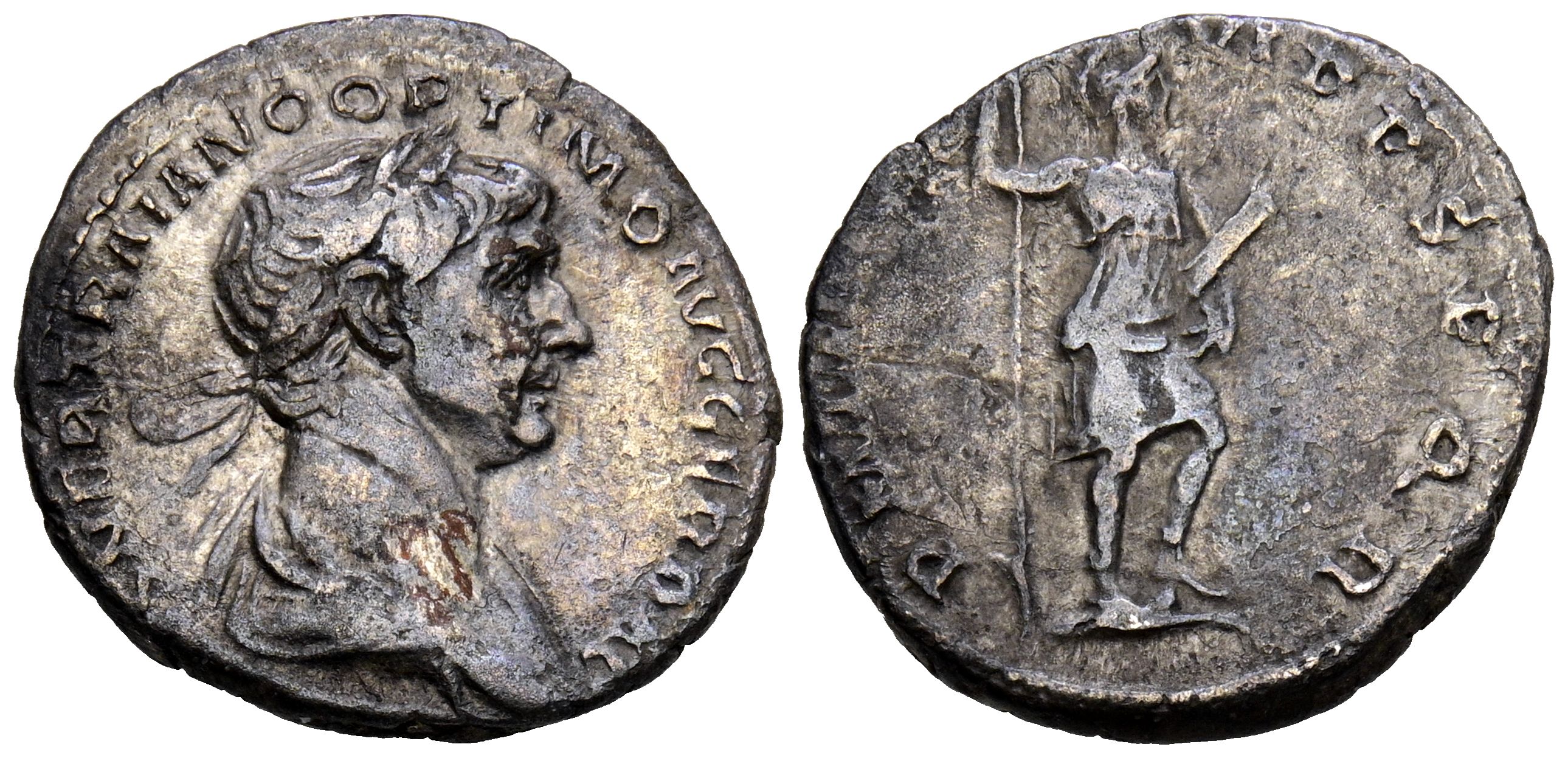 TRAJANO. Denario. (Ar. 3,17g/18mm). 116 d.C. Roma. (RIC 334). Anv: Busto laureado y drapeado de Trajano a derecha, alrededor leyenda: IMP CAES NER TRAIAN OPTIM AVG GER DAC. Rev: Virtus estante a derecha portando lanza y parazonium, pie izquierdo sobre casco, alrededor leyenda: PARTHICO P M TR P COS VI P P SPQR. MBC/MBC-.