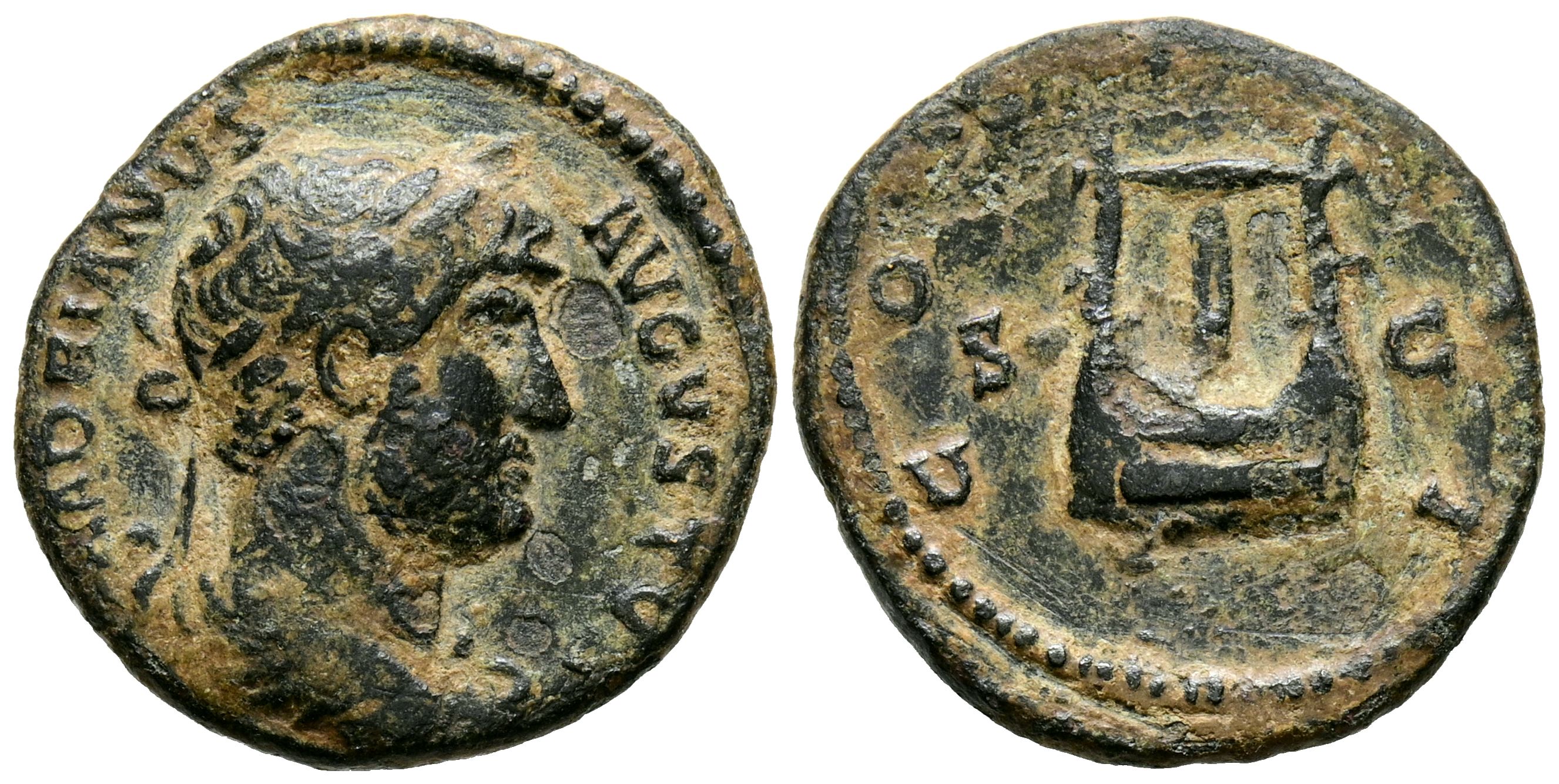 ADRIANO. Semis. (Ae. 2,98g/19mm). 117-138 d.C. Roma. (RIC 688). Anv: Busto laureado, drapeado y coraza de Adriano a derecha, alrededor leyenda: HADRIANVS AVGVSTVS. Rev: Lira, en campo S-C, alrededor leyenda: COS III. MBC.