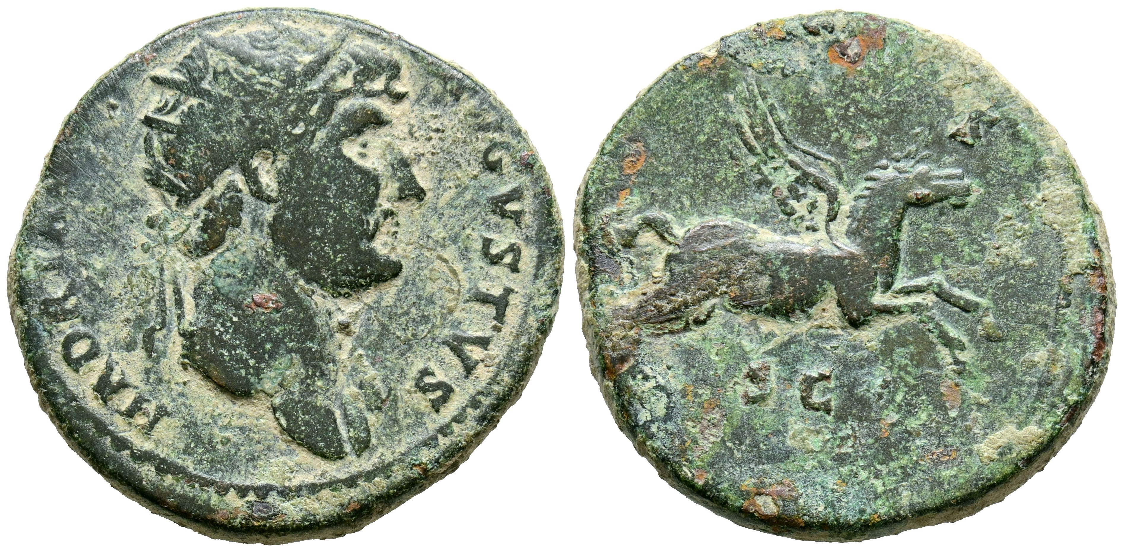 ADRIANO. Dupondio. (Ae. 10,82g/27mm). 125-128 d.C. Roma. (RIC657). Anv: Cabeza radiada de Adriano a derecha, alrededor leyenda: HADRIANVS AVGVSTVS. Rev: Pegaso batiendo las alas a derecha, debajo SC, alrededor leyenda: COS III. MBC-/BC+.