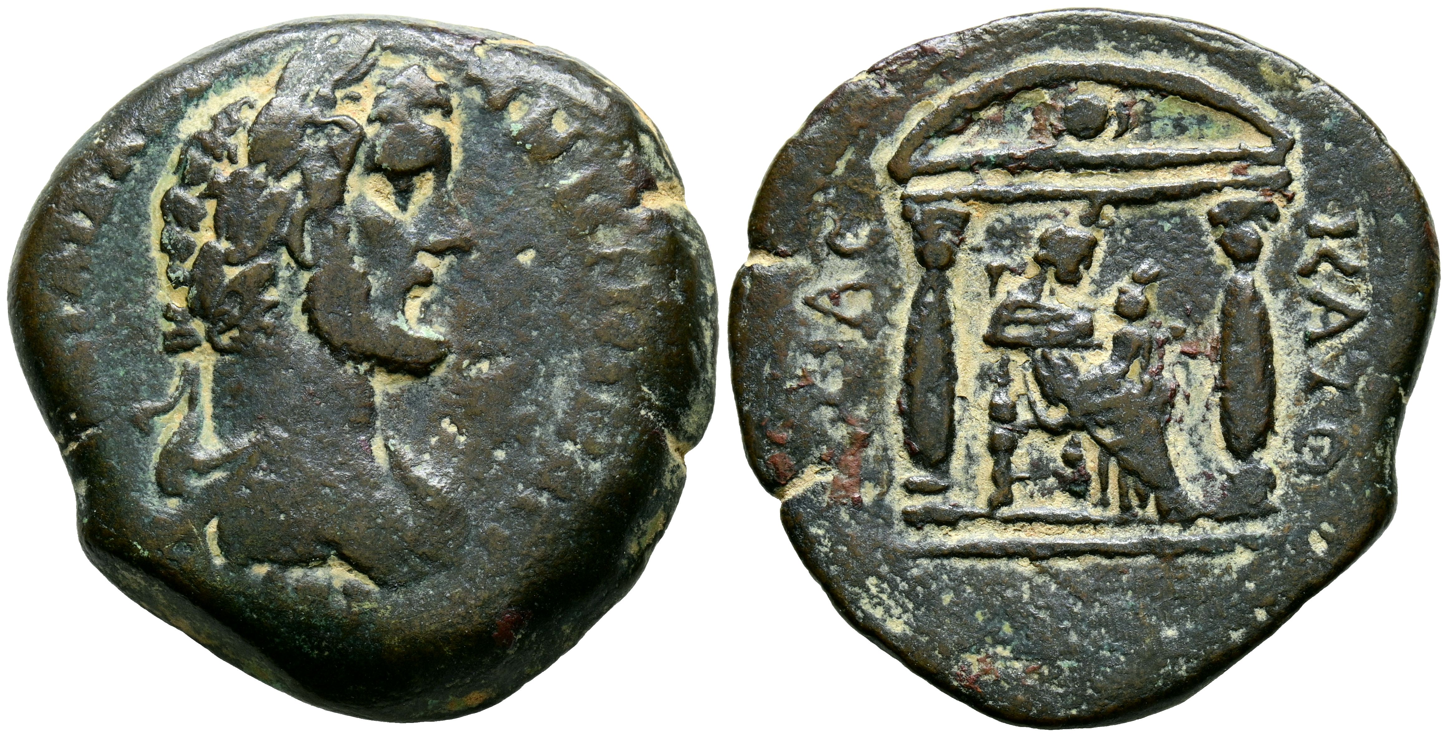ANTONINO PIO. Dracma. (Ae. 22,78g/33mm). 148-149 d.C. (Año 12). Alejandría, Egipto. (RPC 1109; Dattari 3046). Anv: Busto laureado y drapeado de Antonino Pío a derecha, alrededor leyenda: AVG P AV AVT K T AΔP ANTѠNINOC CЄB ЄVC. Rev: Isis sentada en trono a derecha con el infante Harpocrates en sus rodillas, dentro de templo, en exergo: L, alrededor leyenda: ΔωΔЄ KATOV. MBC-.