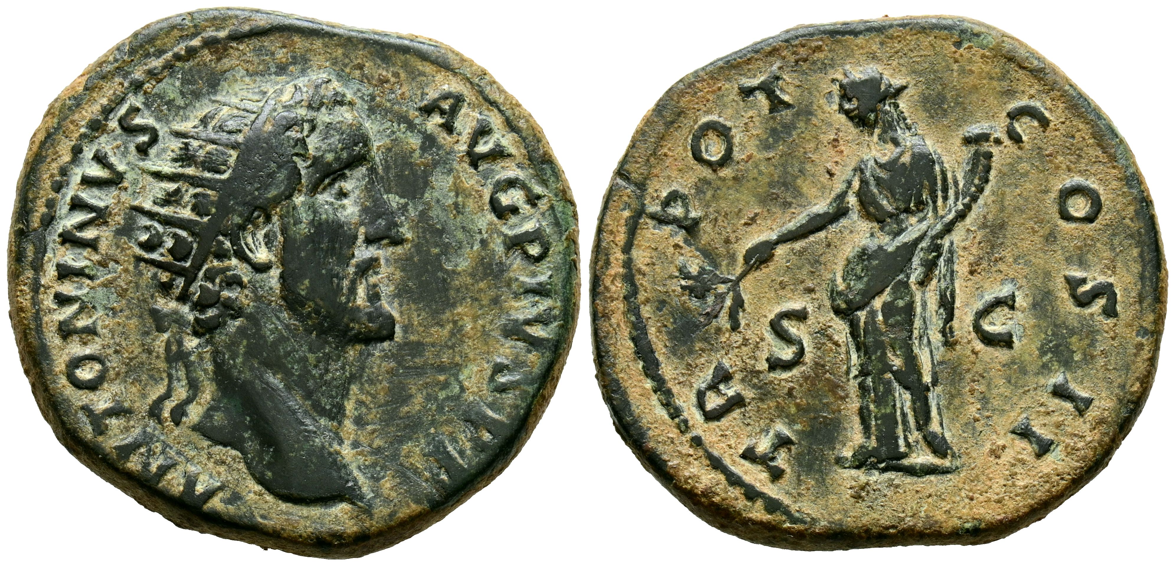 ANTONINO PIO. Dupondio. (Ae. 13,77g/27mm). 140-144 d.C. Roma. (RIC 554). Anv: Cabeza radiada de Antonino Pío a derecha, alrededor leyenda: ANTONINVS AVG PIVS P P. Rev: Pax estante a izquierda portando cornucopia y rama de olivo, en campo: S-C, alrededor leyenda: TR POT COS II. MBC. Rara.