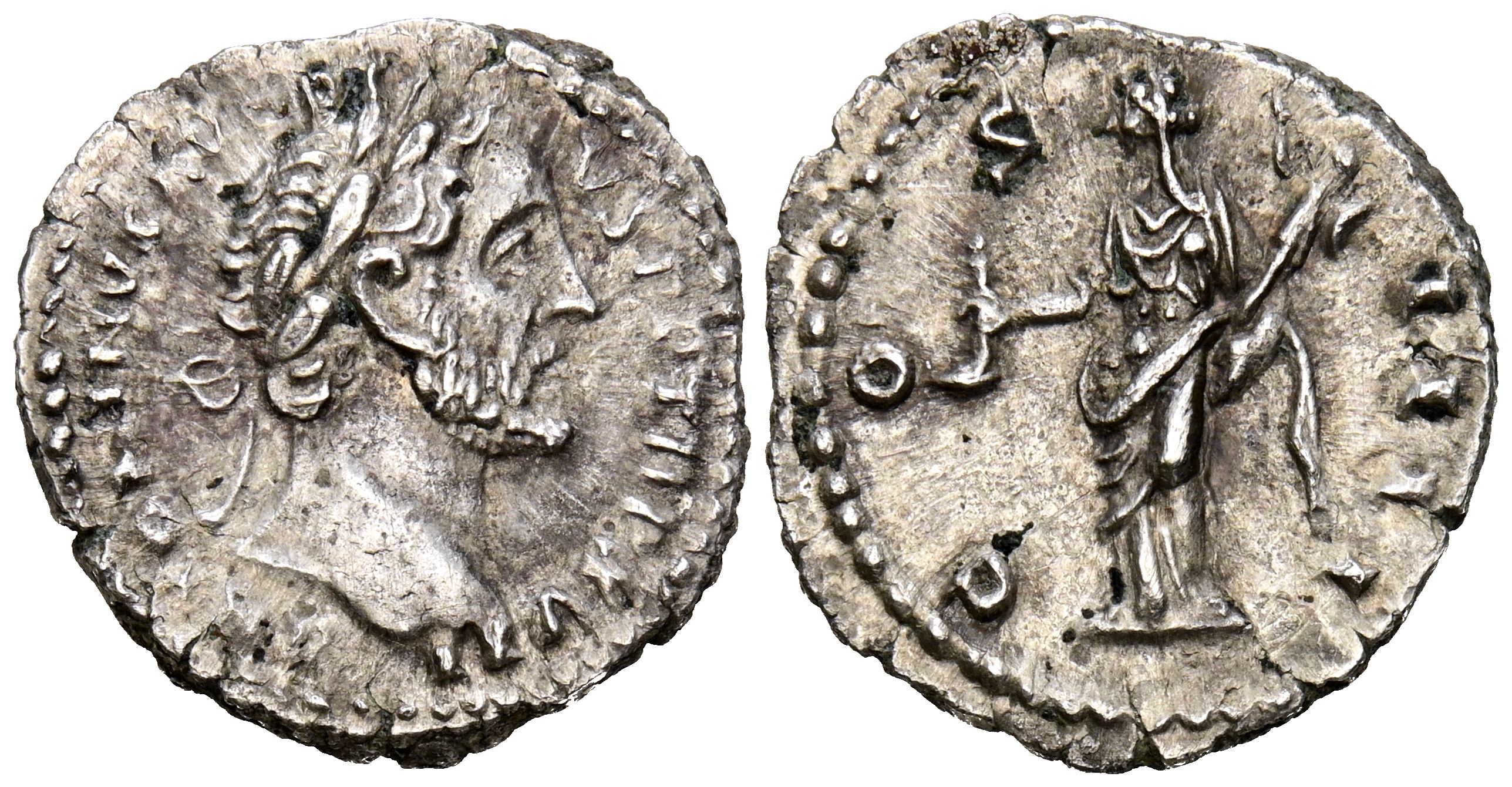 ANTONINO PIO. Denario. (Ar. 2,85g/18mm). 151-152 d.C. Roma. (RIC 229a). Anv: Cabeza laureada de Antonino Pío a derecha, alrededor leyenda: ANTONINVS AVG PIVS P P TR P XVII. Rev: Vesta estante a izquierda portando símpulo y palladium, alrededor leyenda: COS IIII. MBC+.