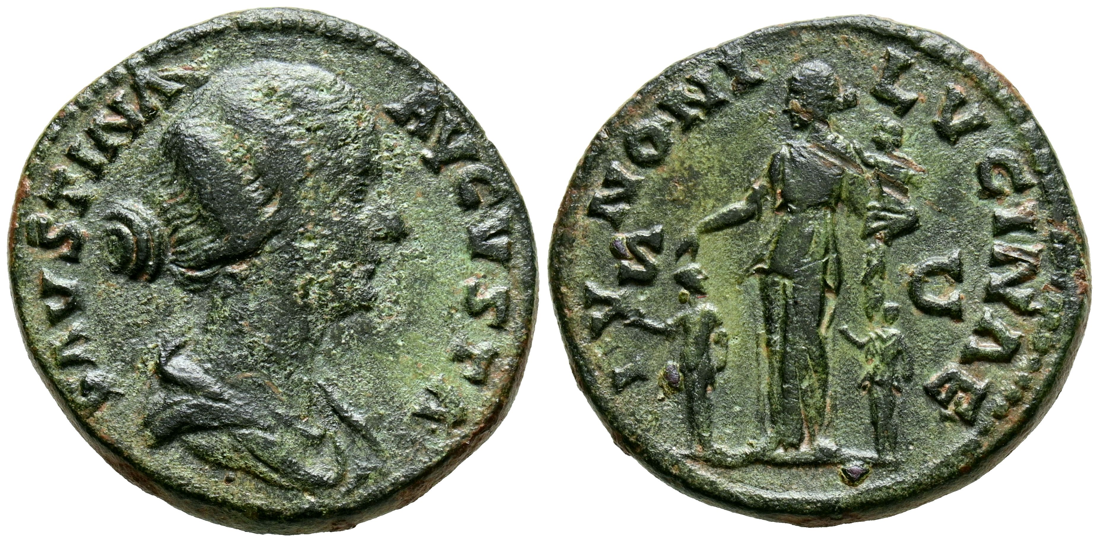 FAUSTINA II. As. (Ae. 11,46g/26mm). 147-175 d.C. Roma. (RIC 1650). Anv: Busto drapeado de Faustina a la derecha, alrededor leyenda: FAVSTINA AVGVSTA. Rev: Juno estante a izquierda entre dos niñas y sosteniendo a un bebé, alrededor leyenda: IVNONI LVCINAE. MBC+. Ligeramente retocado.