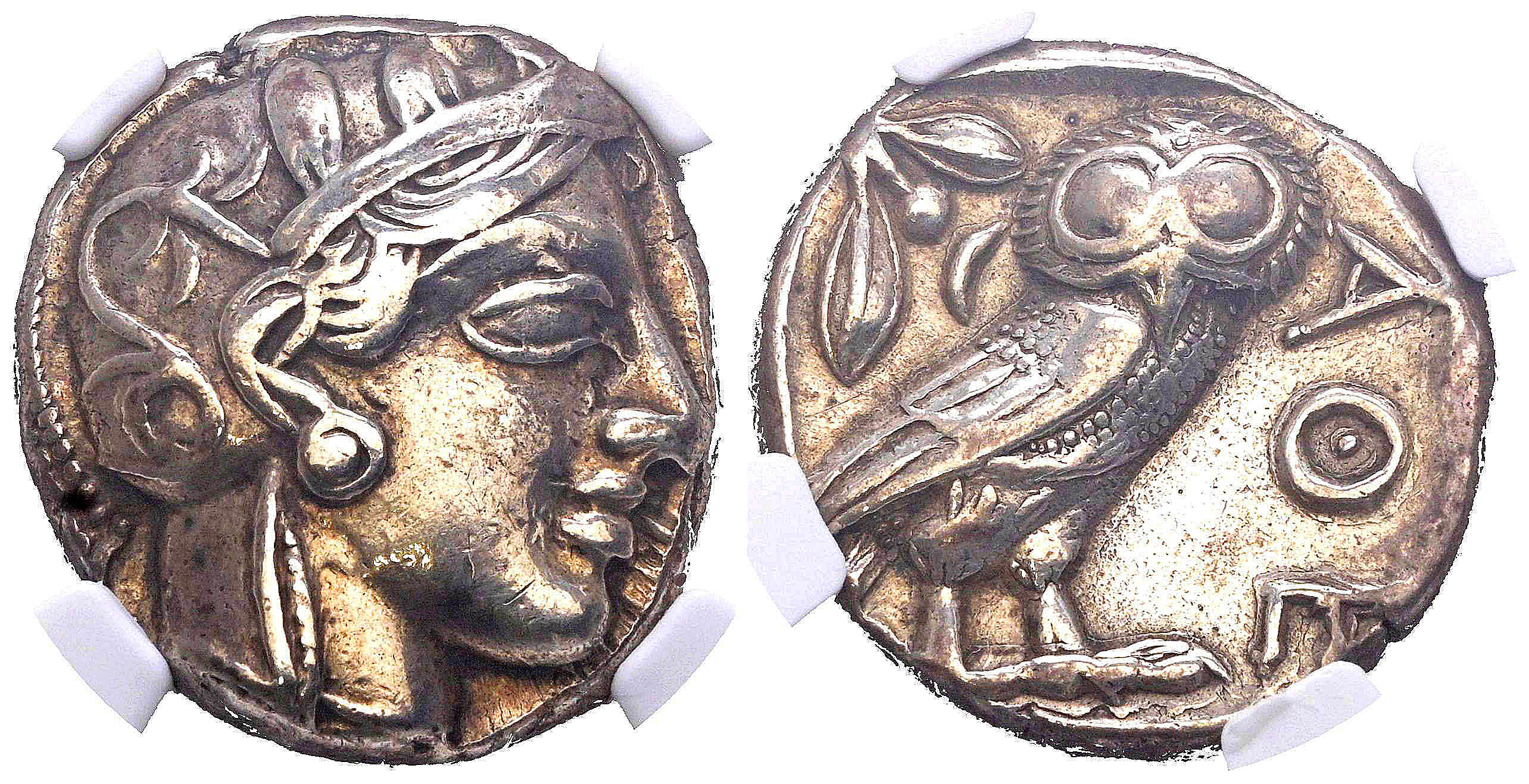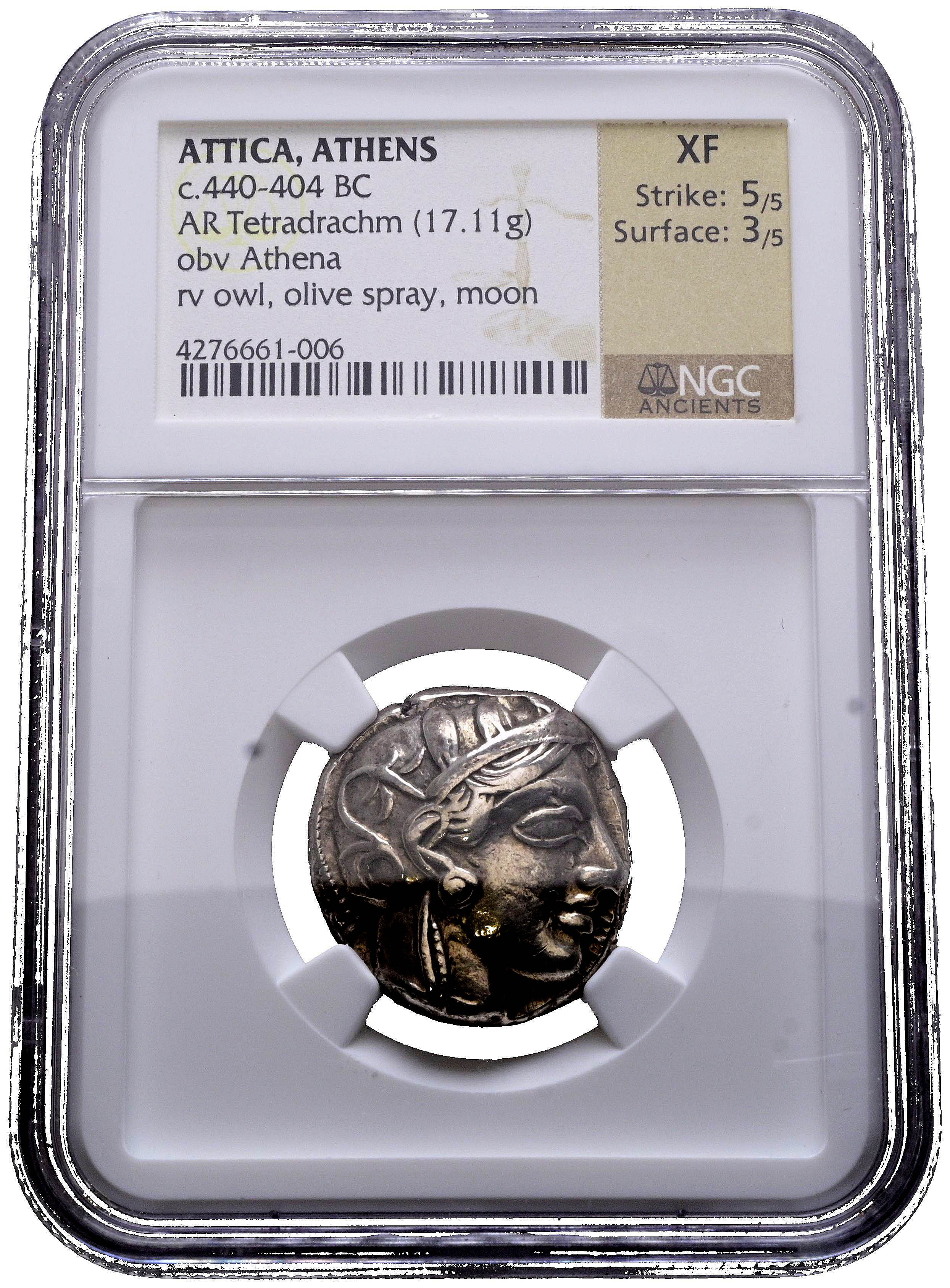 ATTICA, Atenas. Tetradracma. (Ar. 17,11g/23mm). 454-404 a.C. (SNG Copenhague 31). Anv: Cabeza de Atenas con casco ático con cresta a derecha. Rev: Búho estante a derecha mirando de frente, delante: ΑΘΕ, detrás rama de olivo. Encapsulado por NGC XF, Strike: 5/5 - Surface: 3/5.
