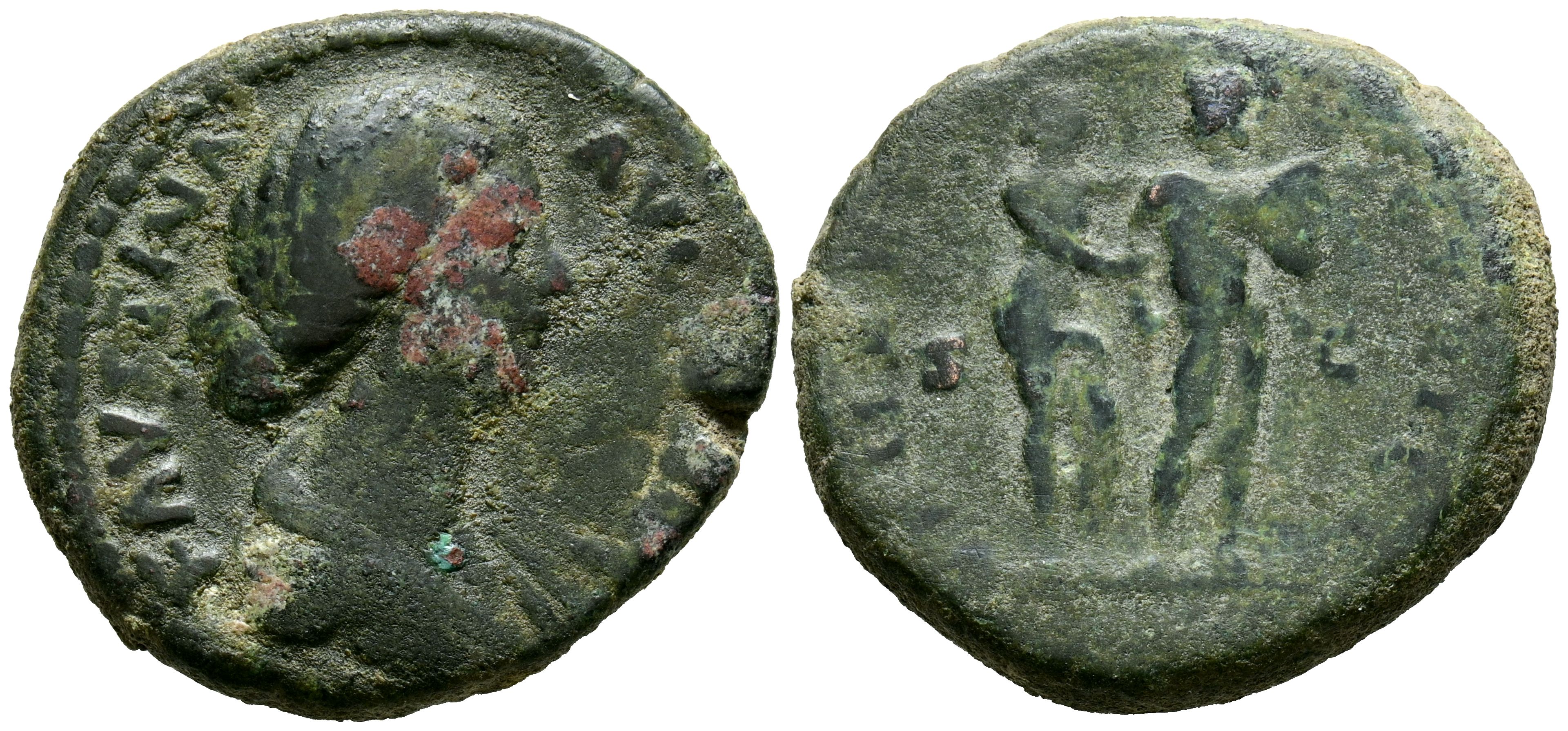 FAUSTINA II. As. (Ae. 13.26g/27mm). 161-176 d.C. Roma. (RIC 1680). Anv: Busto drapeado de Faustina II a derecha, alrededor leyenda: FAVSTINA AVGVSTA. Rev: Venus estante a la derecha, sosteniendo el brazo de Marte estante a derecha y mirando hacia izquierda, en campo: S-C, alrededor leyenda: VENERI VICTRICI. MBC-/BC. Raro ejemplar.