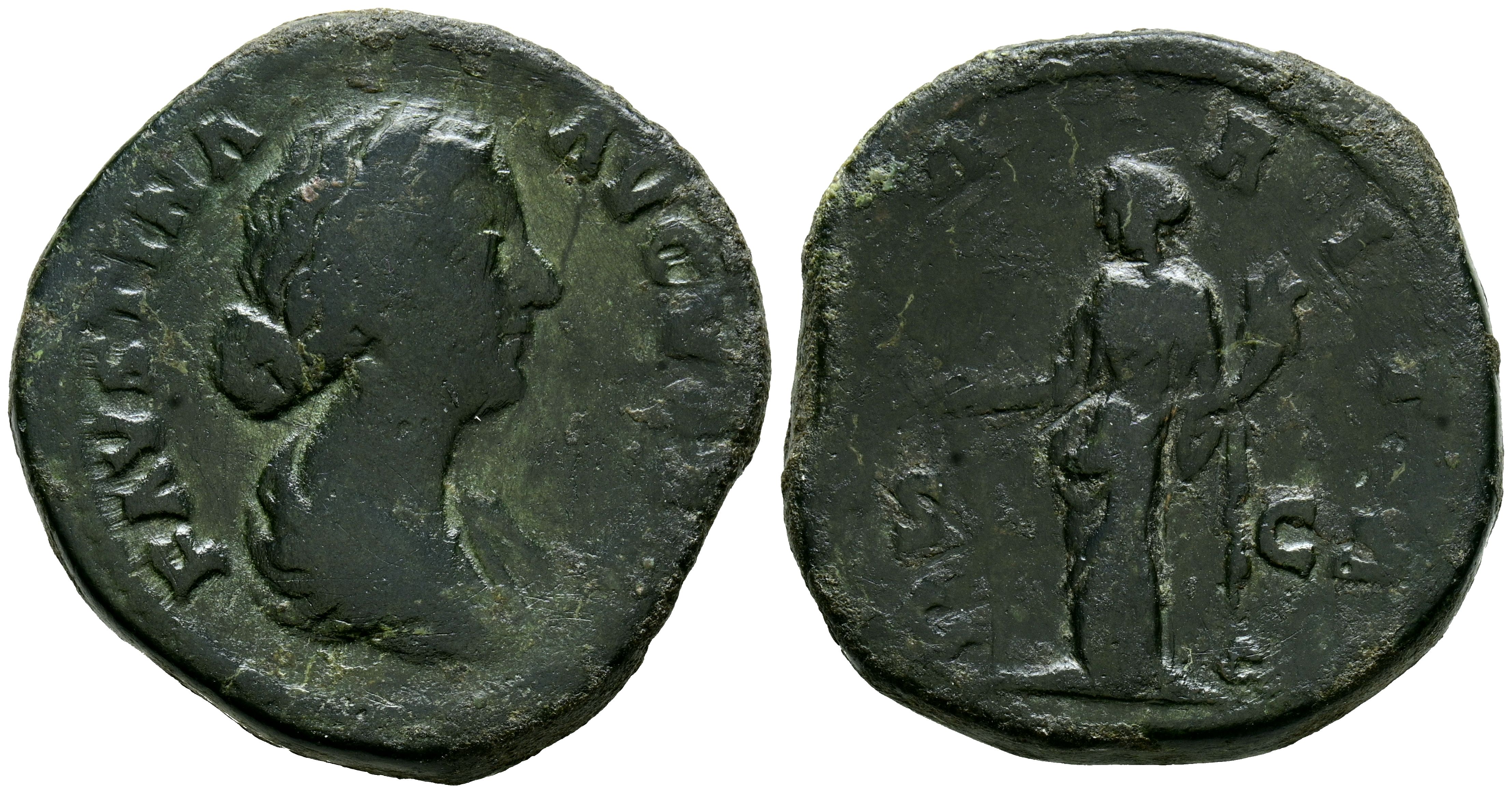 FAUSTINA II. Sestercio. (Ae. 24,99g/32mm). 161-176 d.C. Roma. (RIC 1642). Anv: Busto diademado y drapeado de Faustina II a derecha, alrededor leyenda: FAVSTINA AVGVSTA. Rev: Hilaritas estante a izquierda portando palma y cornucopia, entre: S-C, alrededor leyenda: HILARITAS. MBC-.