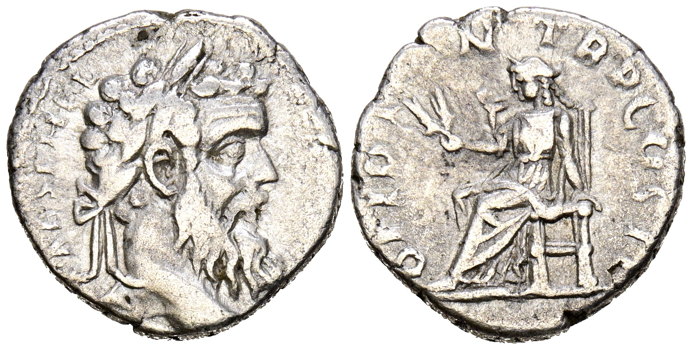PERTINAX. Denario. (Ar. 2,77g/17mm). 192-193 d. C. Roma. (RIC 8a). Anv: Cabeza laureada de Pértinax a derecha, alrededor leyenda: IMP CAESAR HELV PERTIN AVG. Rev: Ops sedente a izquierda portando espigas, alrededor leyenda: OPI DIVIN TR P COS II. MBC/MBC-. Rara.