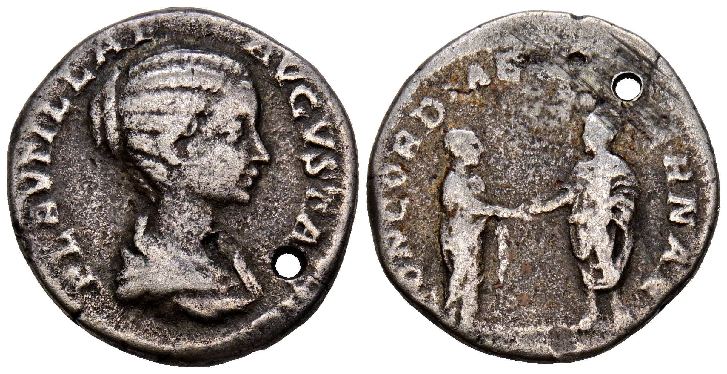 PLAUTILLA. Denario. (Ar. 2,92g/17mm). 202-205 d.C. Roma. (RIC 361). Anv: Busto drapeado de Plautilla a derecha, alrededor leyenda: PLAVTILLAE AVGVSTAE. Rev: Plautilla y Caracalla enfrentados y dándose la mano, alrededor leyenda: CONCORDIAE AETERNAE. MBC-. Limpiado. Perforación.