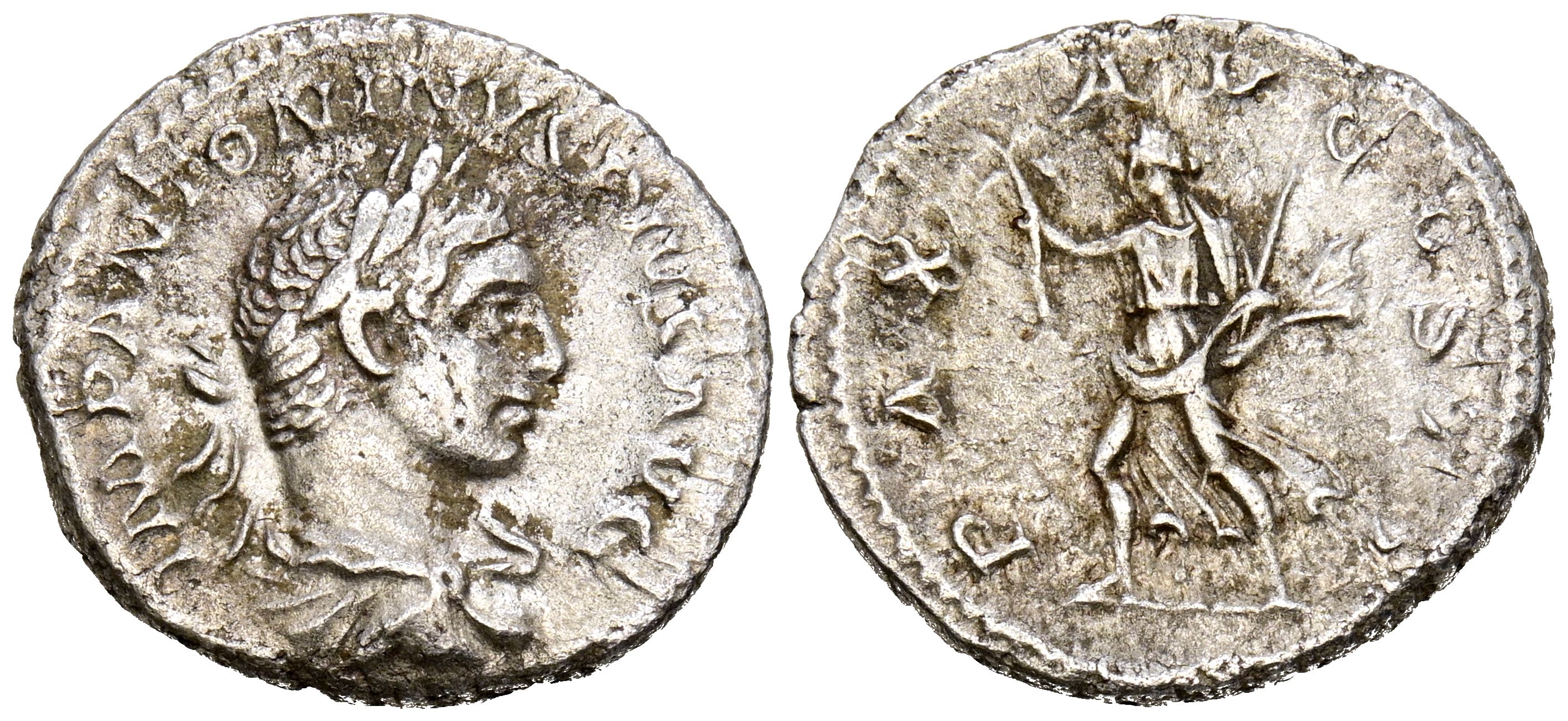 HELIOGABALO. Denario. (Ar. 3,42g/20mm). 222 d.C. Roma. (RIC 125). Anv: Busto laureado y drapeado de Heliogábalo a derecha, alrededor leyenda: IMP ANTONINVS PIVS AVG. Rev: Pax avanzando a izquierda portando rama y cetro, alrededor leyenda: PAX AVGVSTI. MBC.