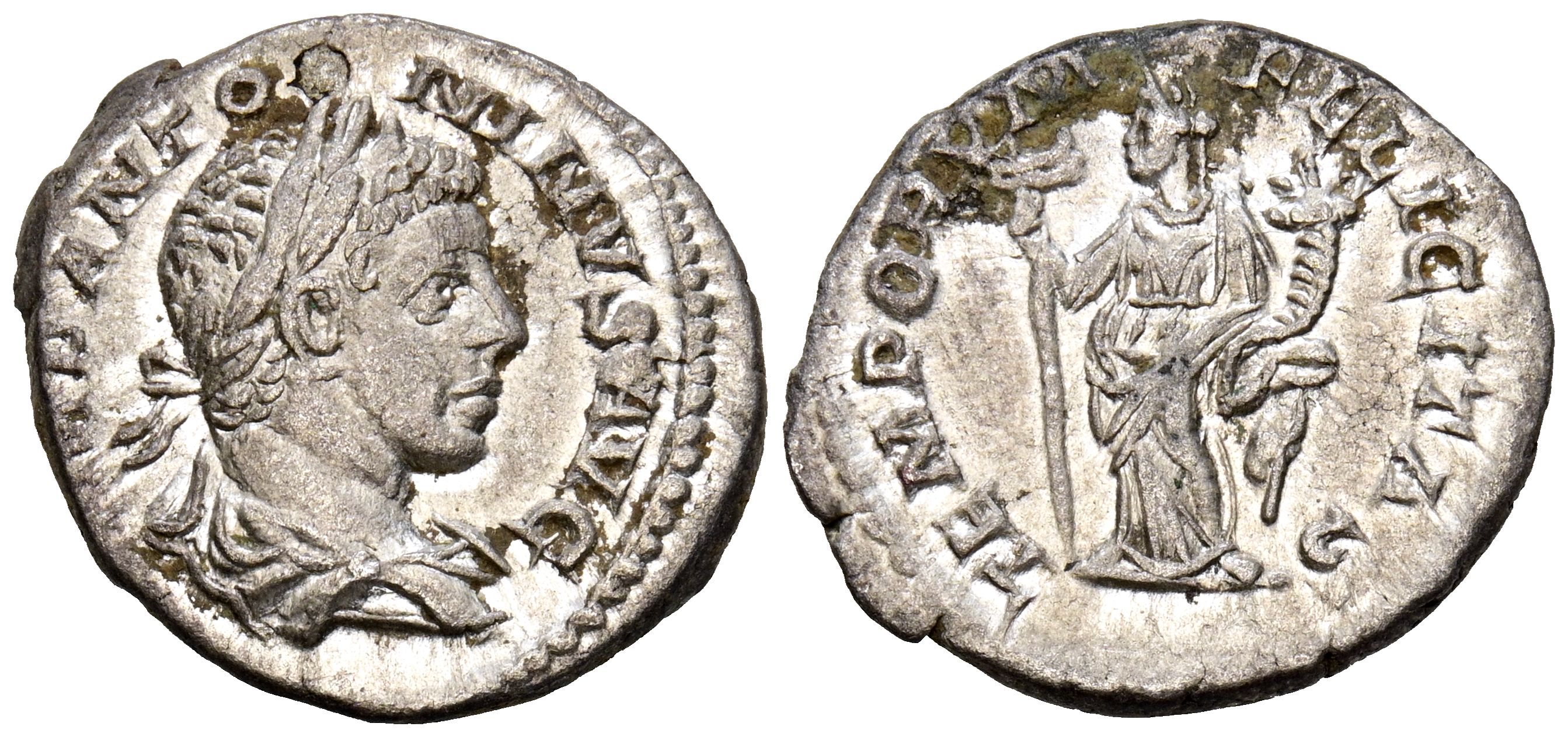 HELIOGABALO. Denario. (Ar. 2,95g/19mm). 219-220 d.C. Roma. (RIC 150). Anv: Busto lauerado y drapeado de Heliogábalo a derecha, alrededor leyenda: IMP ANTONINVS AVG. Rev: Felicitas estante a izquierda portando caduceo y cornucopia, alrededor leyenda: TEMPORVM FELICITAS. MBC+. Restos de brillo original.
