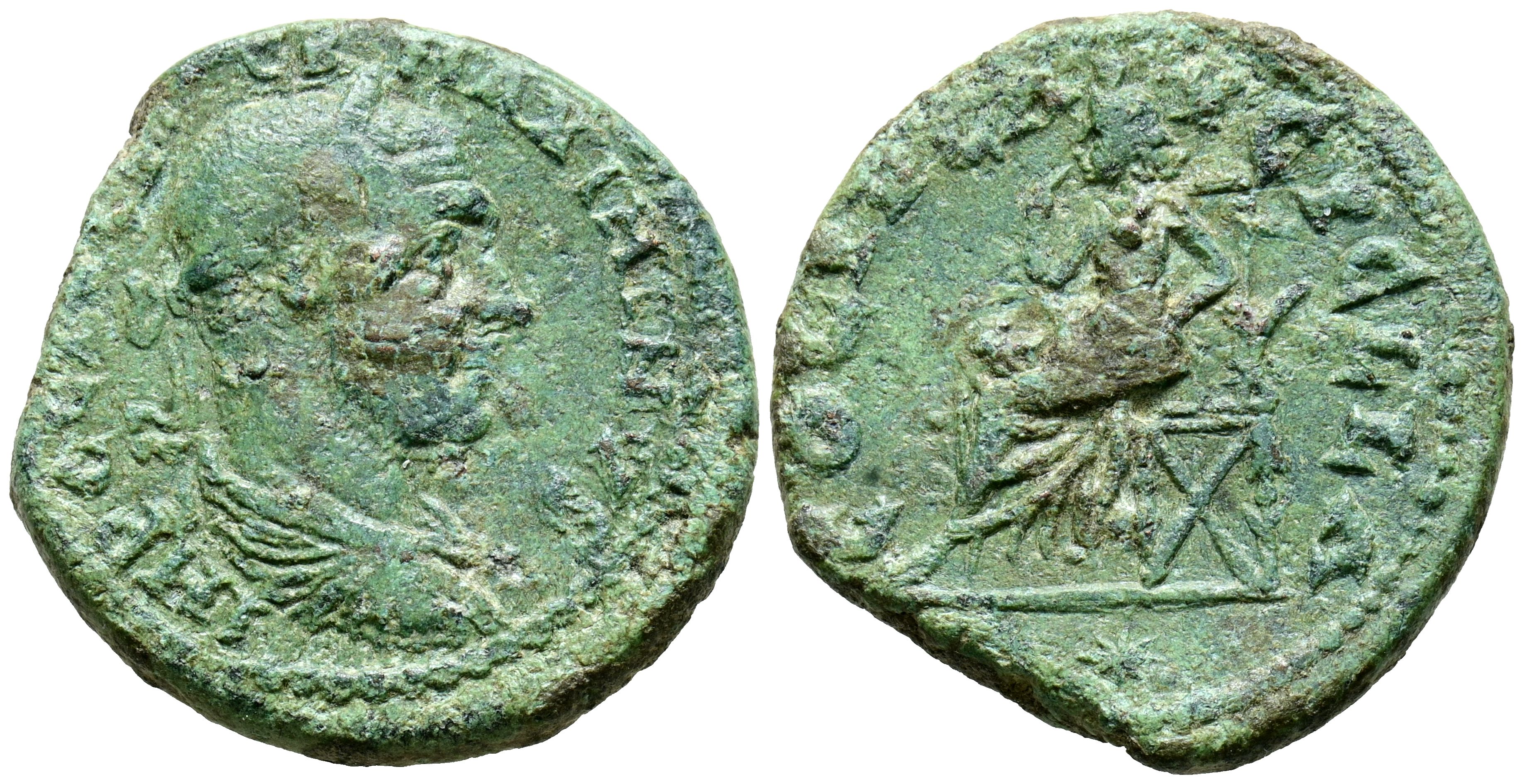 MAXIMINO I. As. (Ae. 10,01g/27mm). 235-238 d.C. Pellas, Macedonia. (Varbanov 3742). Anv: Busto laureado y drapeado de Maximino I a derecha, alrededor leyenda: IMP C C IVL VER MAXIMINVS. Rev: Espes sedente a izquierda, llevándose la mano a la boca, alrededor leyenda: COL IVL AVG PELLA. MBC-.