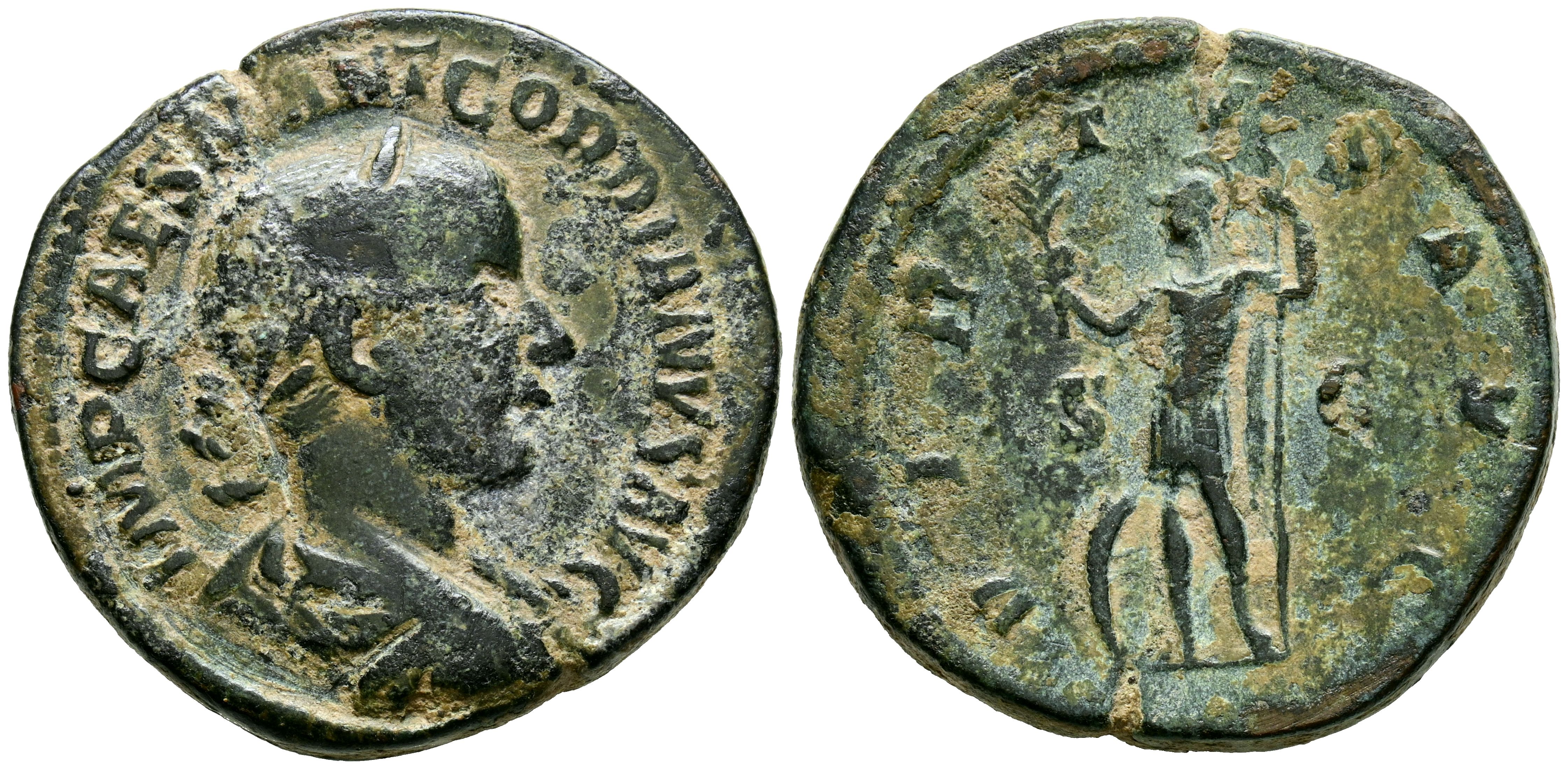GORDIANO III. Sestercio. (Ae. 18,31g/31mm). 240 d.C. Roma. (RIC 273). Anv: Busto laureado y drapeado de Gordiano III a derecha, alrededor leyenda: IMP CAES M ANT GORDIANVS AVG. Rev: Virtus estante a izquierda portando rama de olivo y cetro, en campo: S-C, alrededor leyenda: VIRTVS AVG. MBC-.