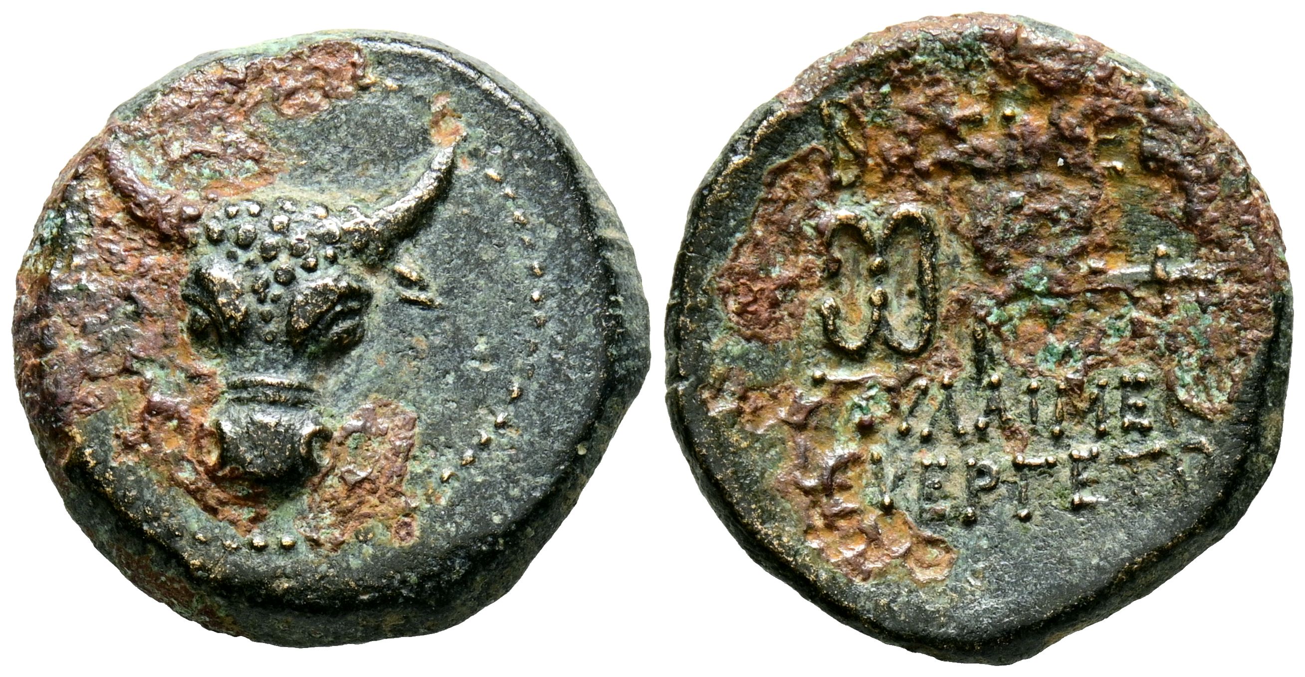 REYES DE PAPHLAGONIA, Pylaimenes II/III Euergetes. Ae18. (Ae. 4,13g/18mm). 133-103 a.C. (SNG Von Aulock 150). Anv: Cabeza de toro de frente. Rev: Kerykeion alado, alrededor leyenda griega: BAΣIΛEΩΣ / ΠΥΛAIMENOΥ / EΥEΡΓETOΥ. MBC-.