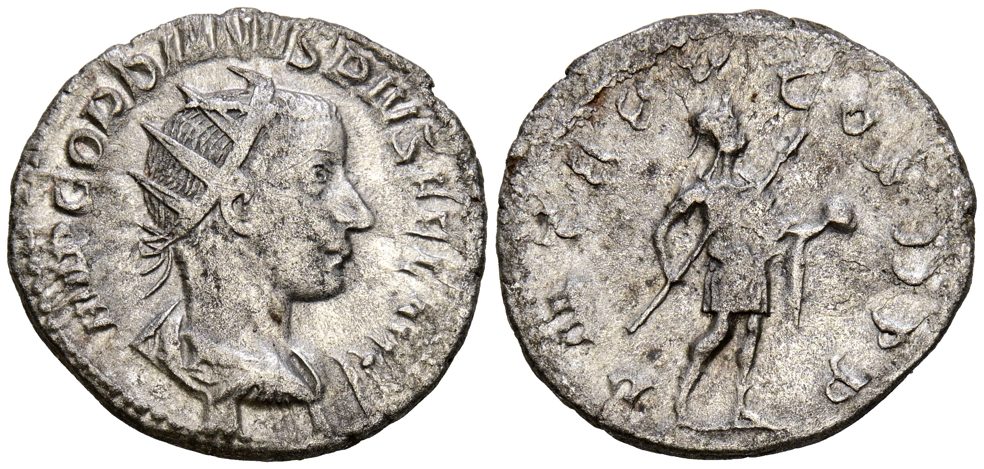 GORDIANO III. Antoniniano. (Ar. 3,61g/22mm). 241-243 d.C. Roma. (RIC 93). Anv: Busto radiado y drapeado de Gordiano III a derecha, alrededor leyenda: IMP GORDIANVS PIVS FEL AVG. Rev: Gordiano III estante a derecha portando lanza y globo, alrededor leyenda: P M TR PV COS II P P. MBC+.
