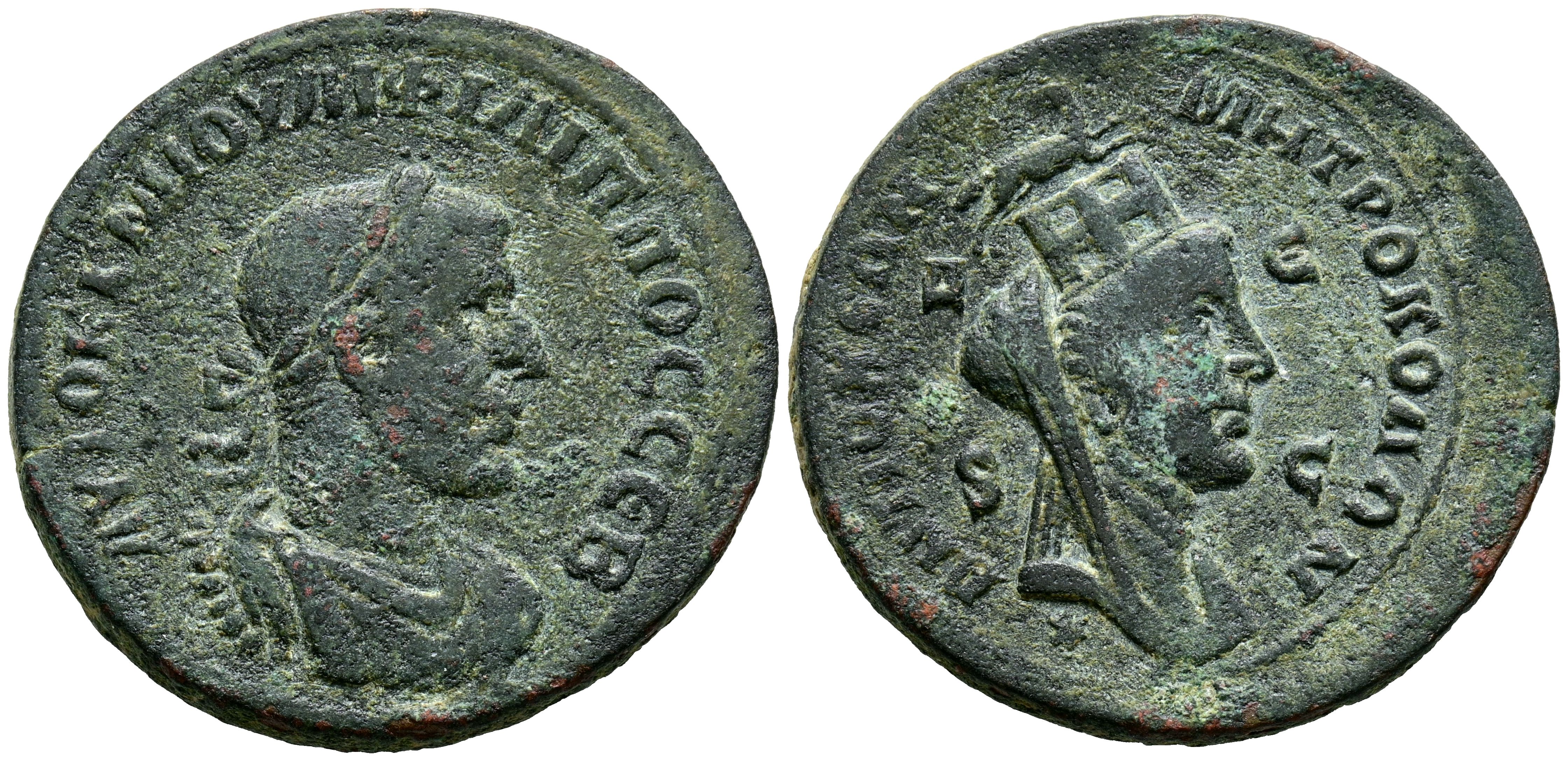 FILIPO II. Octassarian. (Ae. 15,89g/31mm). 247-249 d.C. Seleucis y Pieria, Antioquía. (McAlee 1073). Anv: Busto laureado, drapeado y con coraza de Filipo II a la derecha, alrededor leyenda: AYTOK K M IOYΛI ΦIΛIΠΠOC CЄB. Reverso: Busto de Tyche con corona mural, drapeado y velado hacia la derecha; encima carnero saltando; en campo: Δ-Є y S-C, debajo estrella, alrededor leyenda: ANTIOXEΩN MHTPO KOΛΩN. MBC.