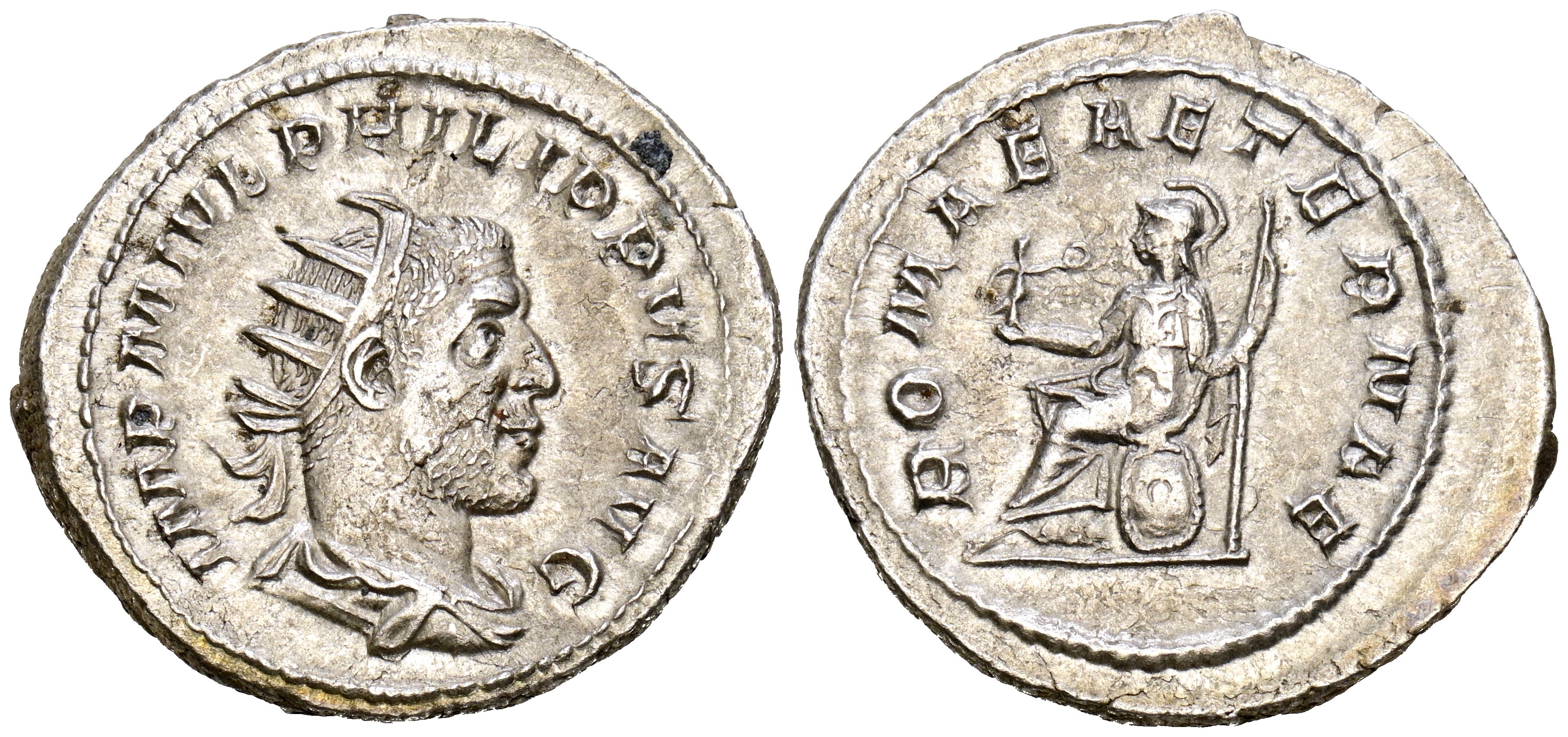 FILIPO I. Antoniniano. (Ar. 5,45g/26mm). 245-247 d.C. Roma. (RIC 44b). Anv: Busto radiado y drapeado de Filipo I a derecha, alrededor leyenda: IMP M IVL PHILIPPVS AVG. Rev: Roma portando Victoria con corona de laurel y lanza, sentada sobre escudo a izquierda, alrededor leyenda: ROMAE AETERNAE. MBC+. Cospel grande.
