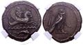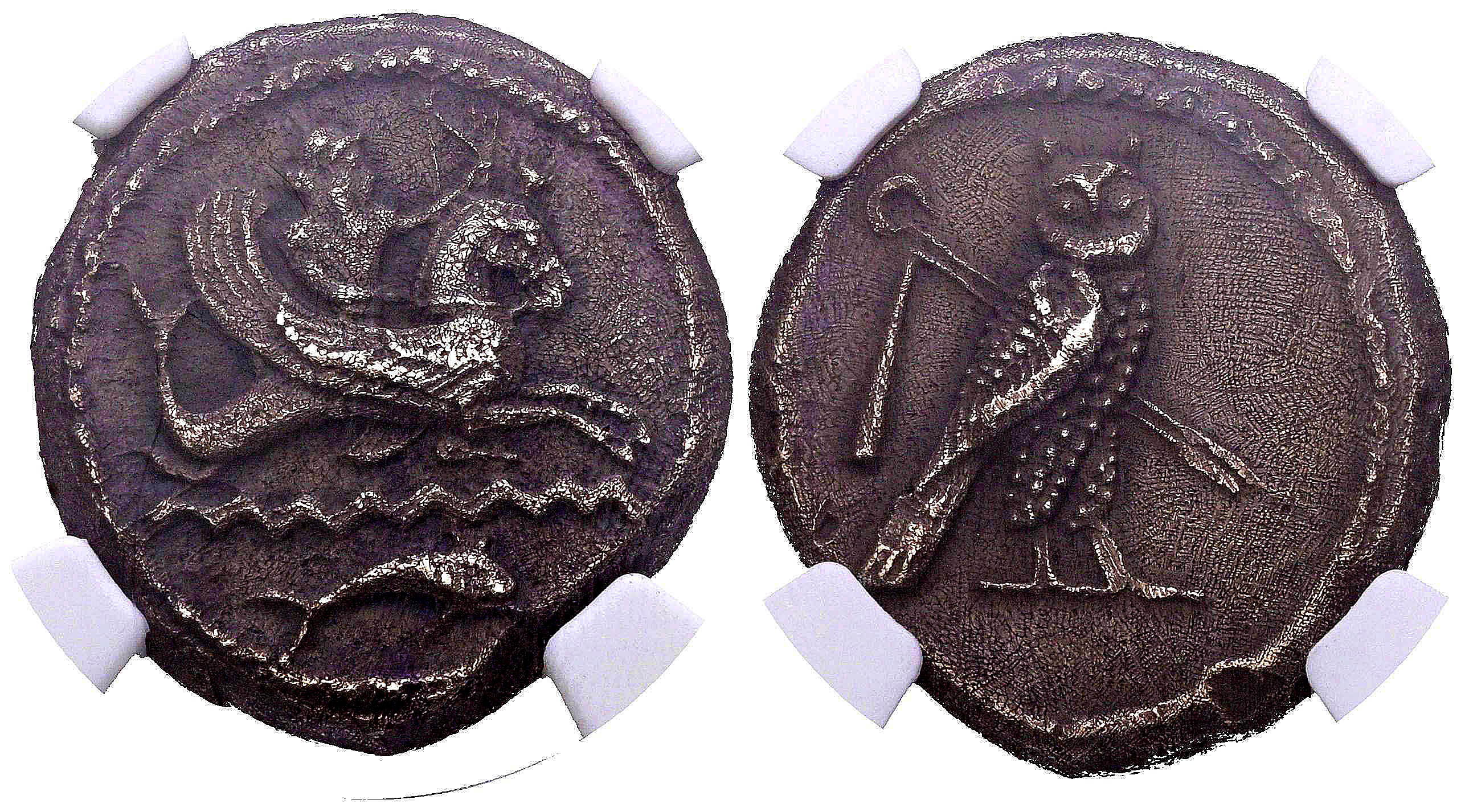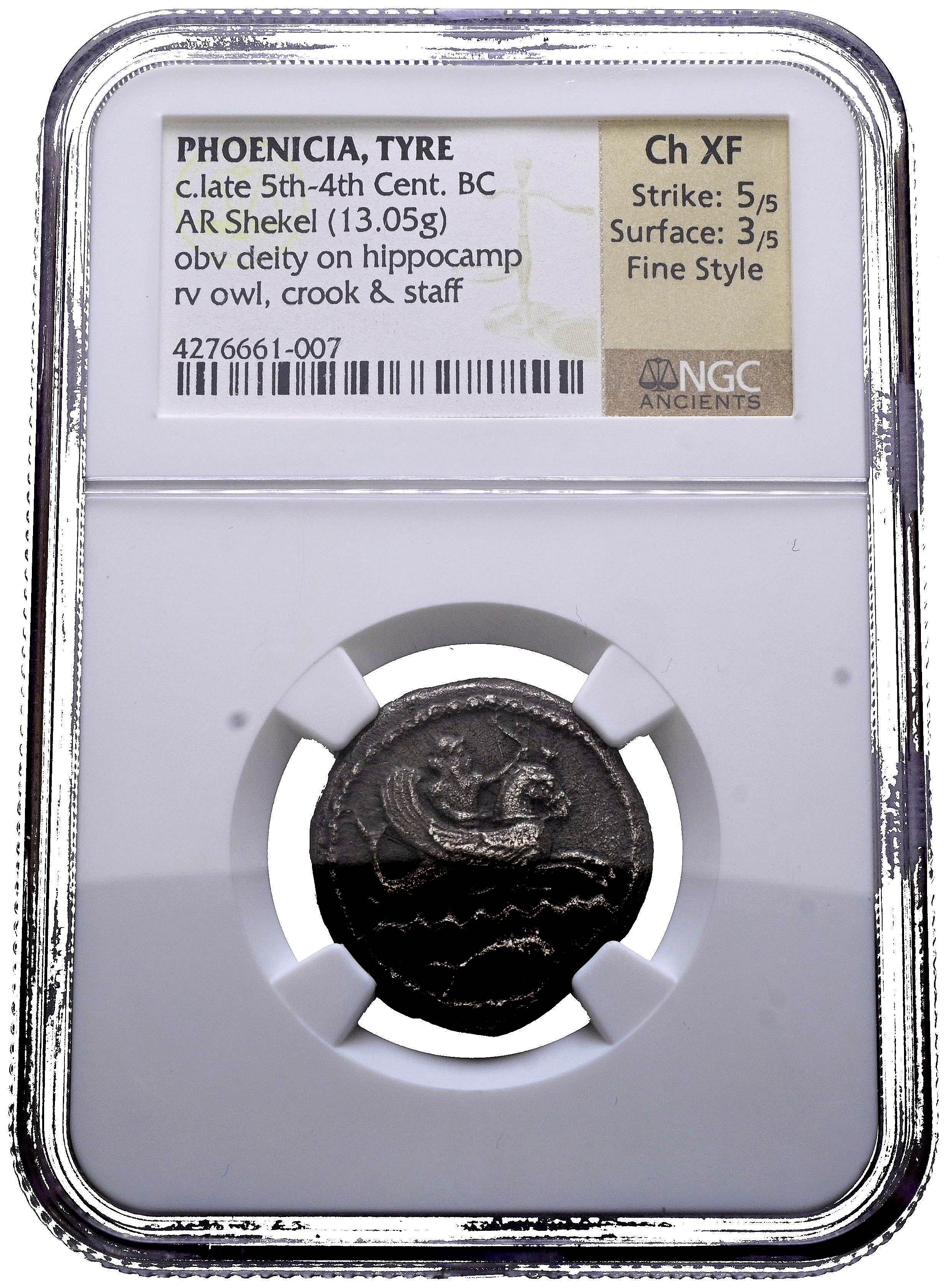 PHOENICIA, Tyre. Shekel. (Ar. 13,05g/22mm). 425-394 a.C. (HGC 10, 315). Anv: Deidad barbadaportando arco y flecha, montando hipocampo alado a derecha sobre río, debajo delfín a derecha. Rev: Búho estante a derecha mirando al frente portando cayado y látigo. Encapsulado por NGC ChXF, Strike: 5/5 - Surface: 3/5. Fine style.