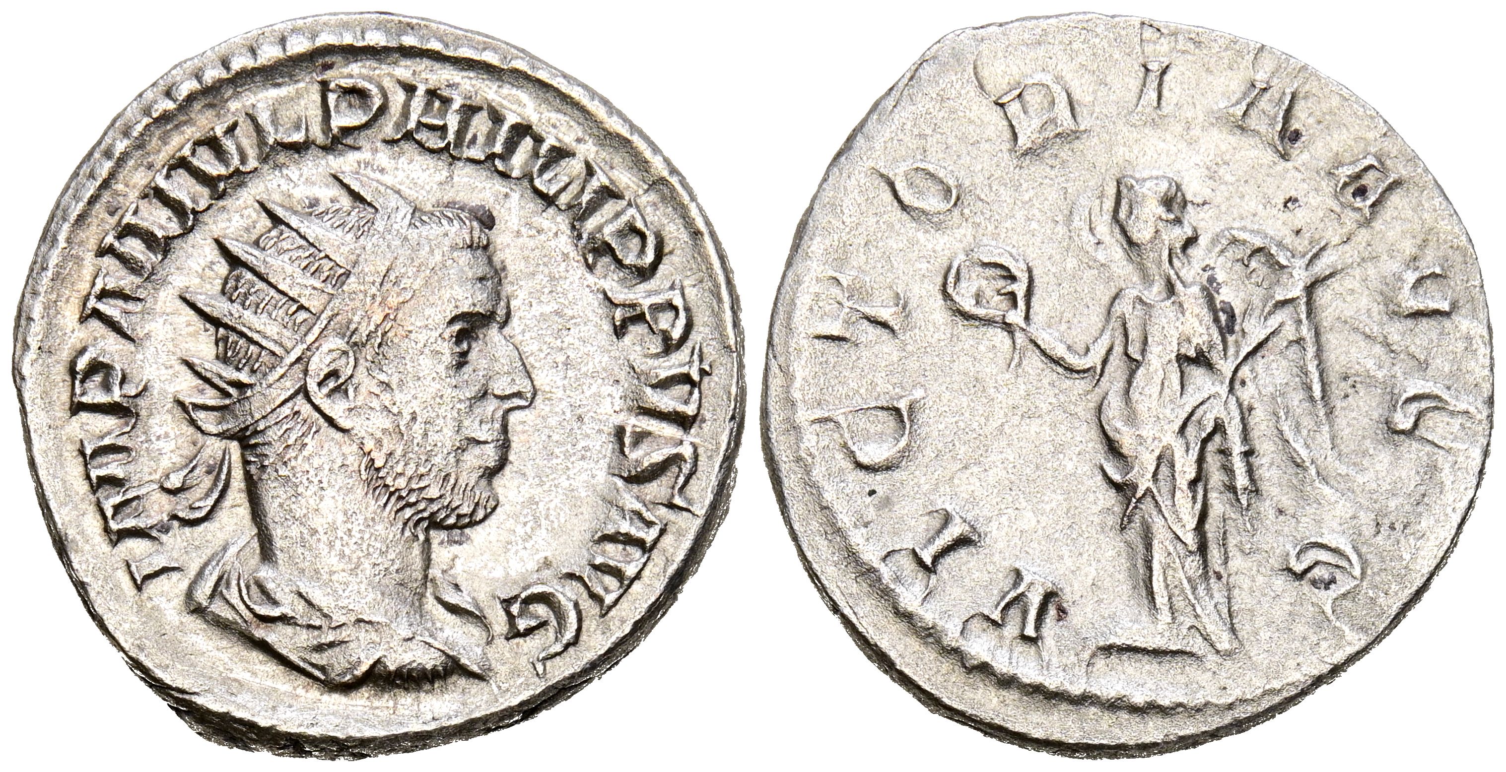 FILIPO I. Antoniniano. (Ar. 3,66g/22mm). 247 d.C. Roma. (RIC 51). Anv: Busto radiado y drapeado de Filipo I a derecha, alrededor leyenda: IMP M IVL PHILIPPVS AVG. Rev: Victoria estante a izquierda portando corona de laurel y palma, alrededor leyenda: VICTORIA AVGG. MBC.