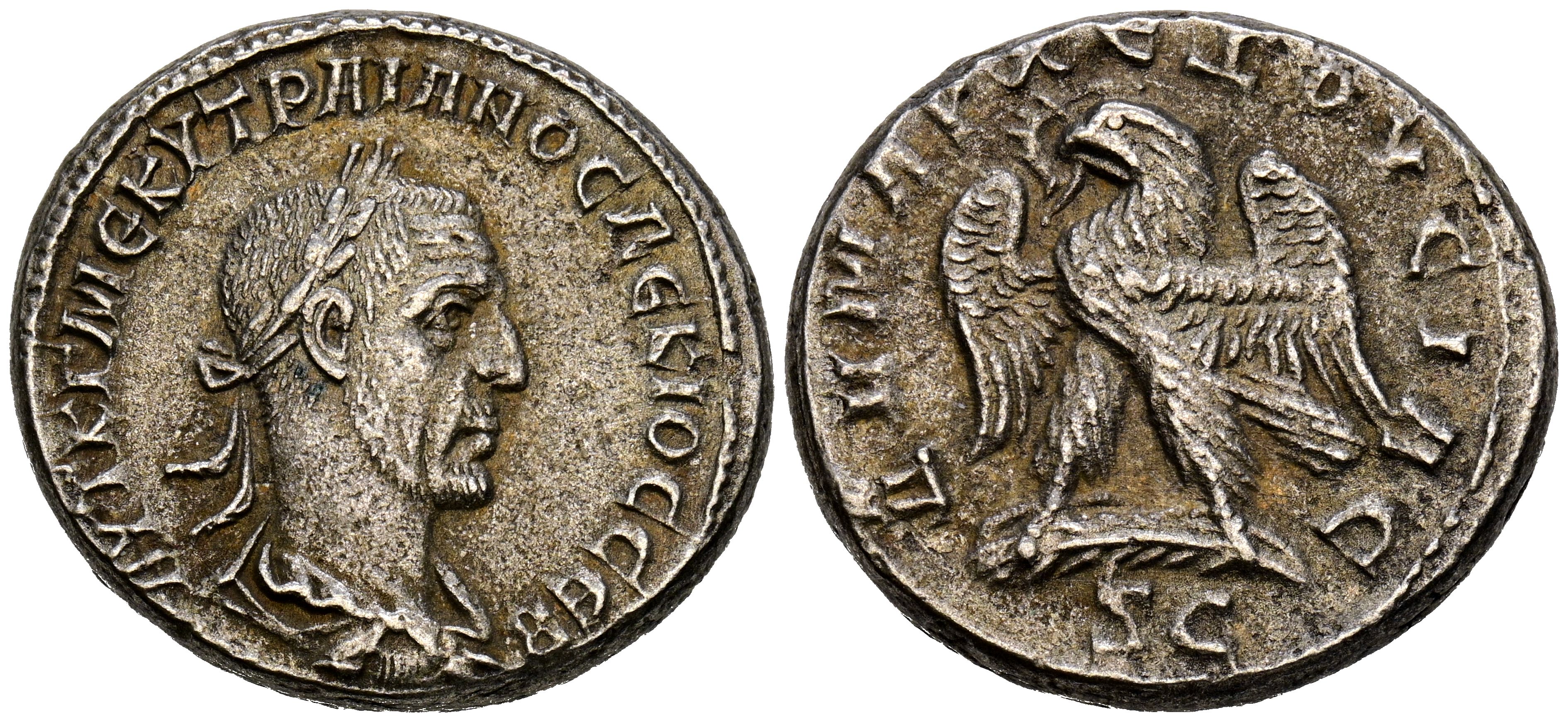 TRAJANO DECIO. Tetradracma. (Ar. 12,48g/27mm). 249-251 d.C. Seleucis y Pieria, Antioquía. (RPC 1621). Anv: Busto laureado y drapeado de Trajano Decio a derecha, alrededor leyenda: ΑΥΤ Κ Γ ΜЄ ΚΥ ΤΡΑΙΑΝΟϹ ΔЄΚΙΟϹ ϹЄΒ. Rev: Aguila estante a izquierda sobre palma con corona de laurel en el pico, debajo: SC, alrededor leyenda: ΔΗΜΑΡΧ ЄΞΟΥϹΙΑϹ. MBC+.