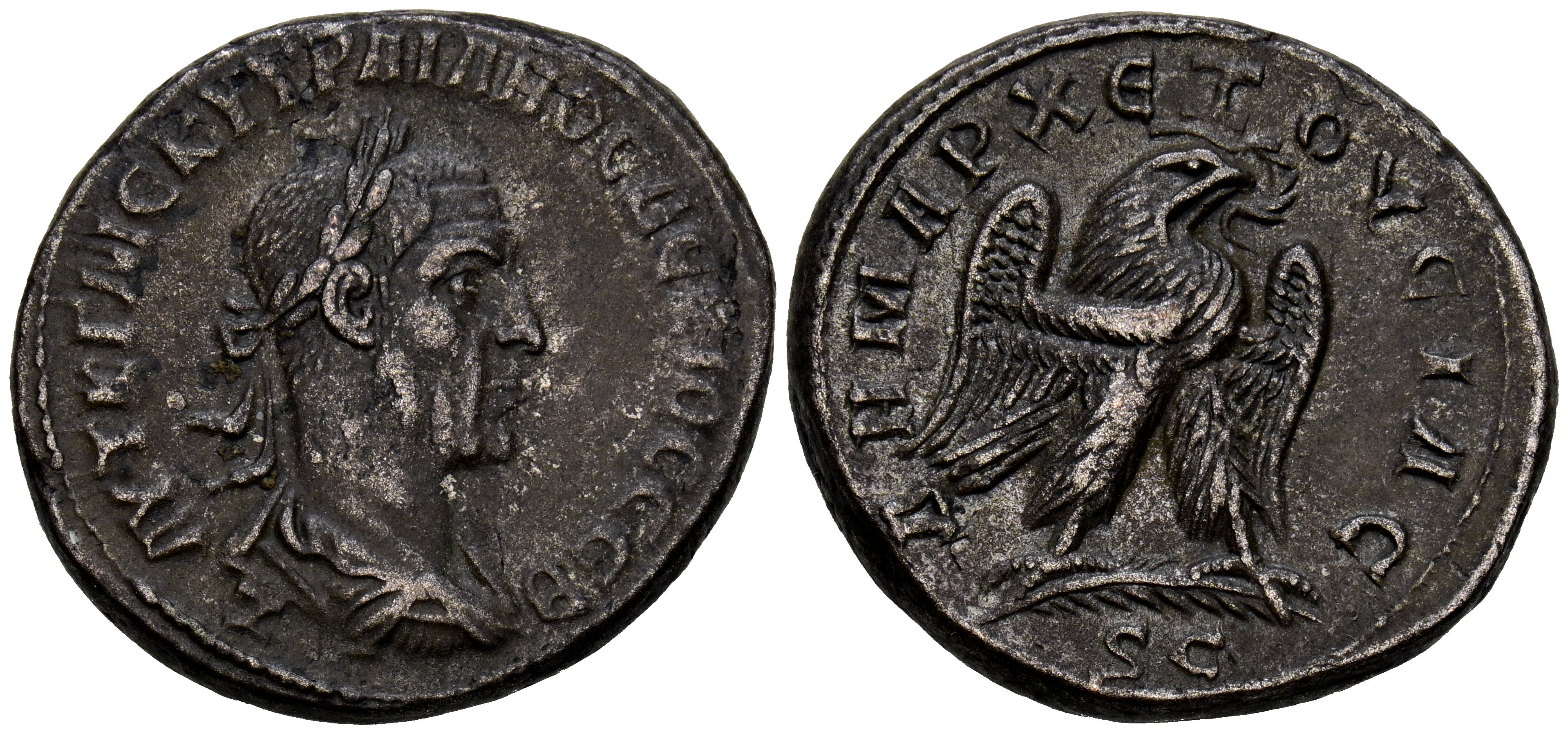 TRAJANO DECIO. Tetradracma. (Ar. 12,51g/27mm). 249-251 d.C. Seleucis y Pieria, Antioquía. (RPC 1689). Anv: Busto laureado y drapeado de Trajano Decio a derecha, alrededor leyenda: ΑΥΤ Κ Γ ΜЄ ΚΥ ΤΡΑΙΑΝΟϹ ΔЄΚΙΟϹ ϹЄΒ. Rev: Aguila estante a derecha sobre palma con corona de laurel en el pico, debajo: SC, alrededor leyenda: ΔΗΜΑΡΧ ЄΞΟΥϹΙΑϹ. MBC+.