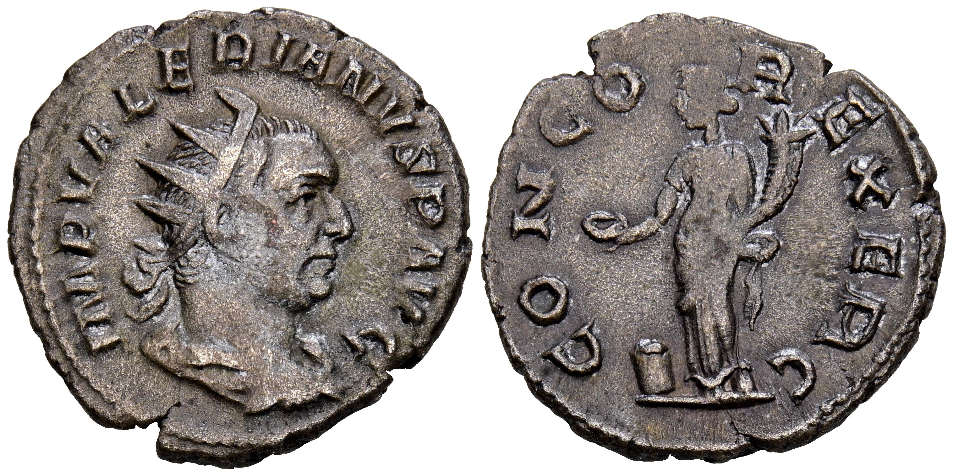 VALERIANO I. Antoniniano. (Ar. 3,42g/21mm). 254-255 d.C. Viminacium. (RIC 233). Anv: Busto radiado y drapeado de Valeriano I a derecha, alrededor leyenda: IMP VALERIANVS P AVG. Rev: Concordia estante a izquierda portando cornucopia y patera sobre altar, alrededor leyenda: CONCOR EXERC. MBC.