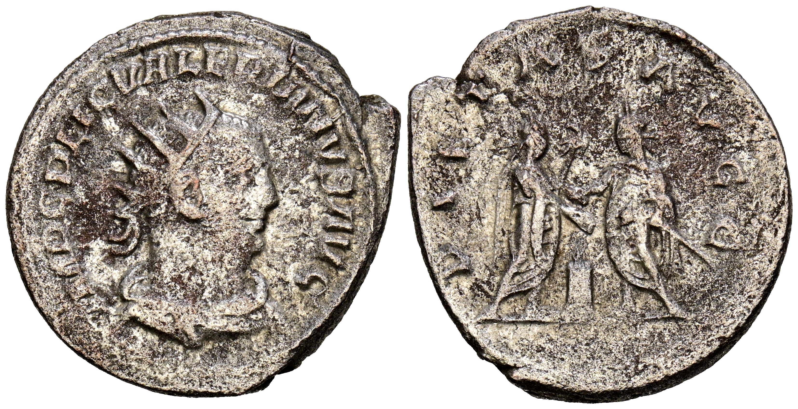 VALERIANO I. Antoniniano. (Ve. 4,19g/25mm). 256-260 d.C. Samosata. (RIC 285). Anv: Busto radiado y drapeado de Valeriano I a derecha, alrededor leyenda: IMP C P LIC VALERIANVS P F AVG. Rev: Valeriano I y Galieno enfrentados, entre ellos altar y ambos con cetros con águilas, alrededor leyenda: PIETAS AVGG. MBC-.