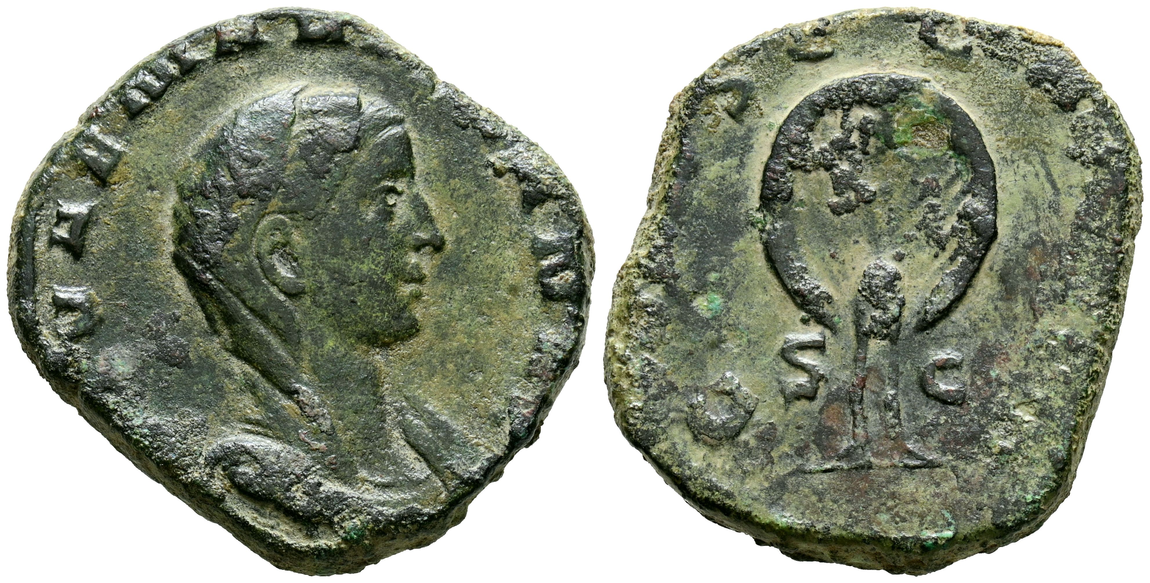 MARINIANA. Sestercio. (Ae. 19,26g/30mm). 255 d.C. Roma. (RIC 10). Anv: Busto drapeado y diademado de Mariniana a derecha, alrededor leyenda: DIVAE MARINIANAE. Rev: Pavo real estante de frente, entre: S-C, alrededor leyenda: CONSECRATIO. MBC-.