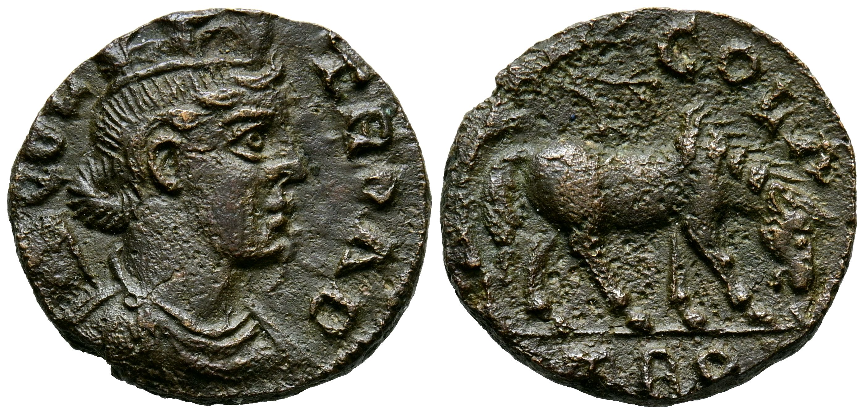 PSEUDO-AUTONOMO, Tiempo de Galieno. Ae20. (Ae. 4,44g/20mm). 251-260 d.C. Alejandría, Troas. (Bellinger A486). Anv: Busto de Tyche con corona mural, alrededor leyenda: COL TROAS. Rev: Caballo pastando a derecha, encima leyenda: COL AVG, debajo: TRO. MBC.