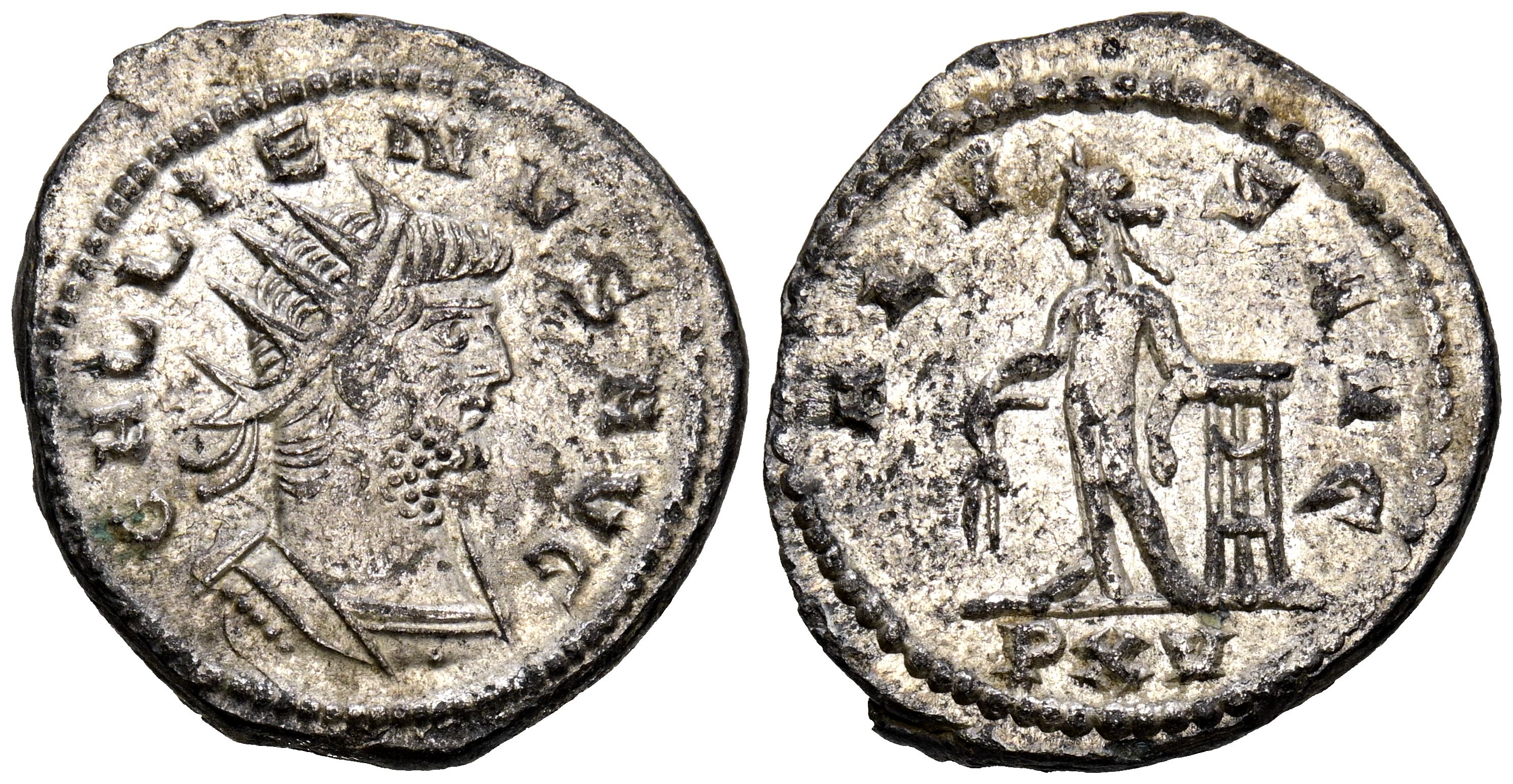 GALIENO. Antoniniano. (Ve. 3,43g/22mm). 267 d.C. Antioquía. (RIC 610). Anv: Busto radiado y con coraza de Galieno a derecha, alrededor leyenda: GALLIENVS AVG. Rev: Apolo estante a derecha portando espigas y apoyado sobre trípode, en exergo: PXV, alrededor leyenda: SALVS AVG. EBC. Plateado original. Bonito ejemplar.