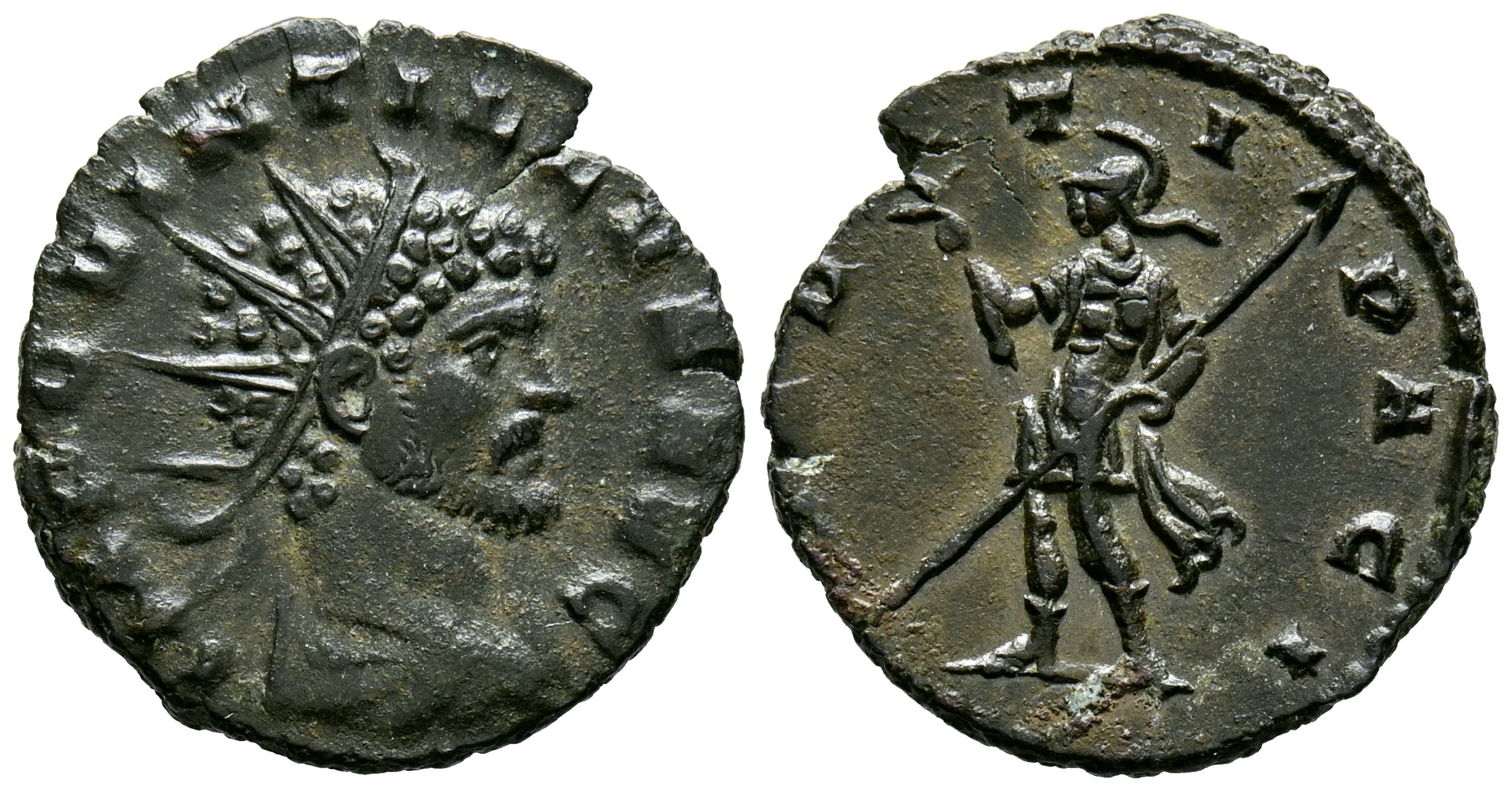 QUINTILO. Antoniniano. (Ae. 2,27g/19mm). 270 d.C. Mediolanum. (RIC 1111). Anv: Busto radiado, drapeado y con coraza de Quintilo a la derecha, alrededor leyenda: IMP QUINTILLVS AVG. Rev: Marte estaente a la izquierda, portando rama de olivo y lanza, en exergo P, alrededor leyenda: MARTI PACI. MBC+/EBC-.