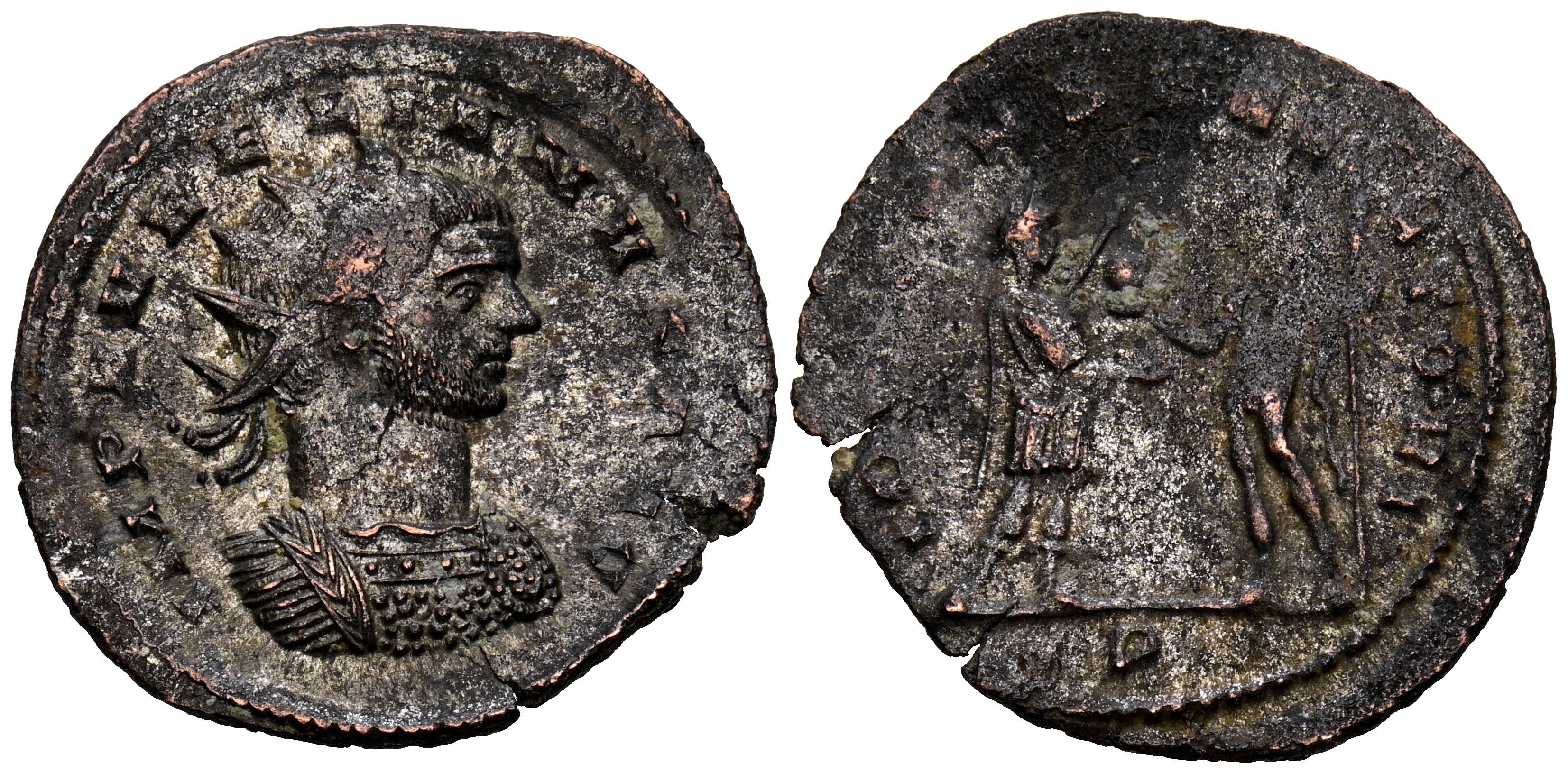 AURELIANO. Antoniniano. (Ae. 2,77g/24mm). 271 d.C. Mediolanum. (RIC 131). Anv: Busto radiado y con coraza de Aureliano a derecha, alrededor leyenda: IMP AVRELIANVS AVG. Rev: Aureliano estante a derecha recibiendo globo de Júpiter con cetro, en exergo: P, alrededor leyenda: IOVI CONSERVATORI. MBC+/MBC-.