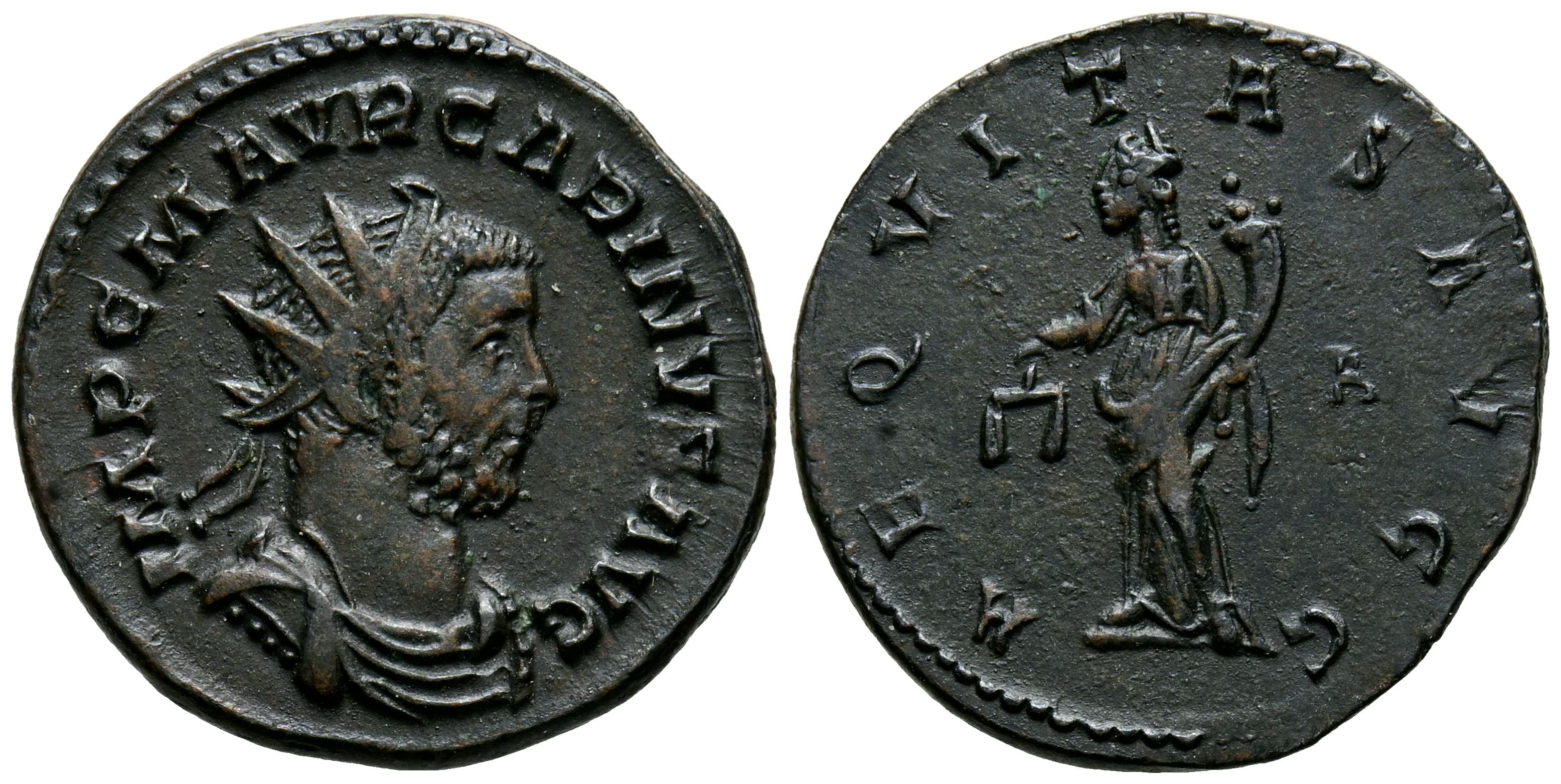CARINO. Antoniniano. (Ae. 3,86g/22mm). 283-284 d.C. Lugdunum. (RIC 212). Anv: Busto radiado, drapeado y con coraza de Carino a derecha, alrededor leyenda: IMP C M AVR CARINVS AVG. Rev: Aequitas estante a izquierda portando escalas y cornucopia, en campo A, alrededor leyenda: AEQVITAS AVGG. EBC-. Repasado.