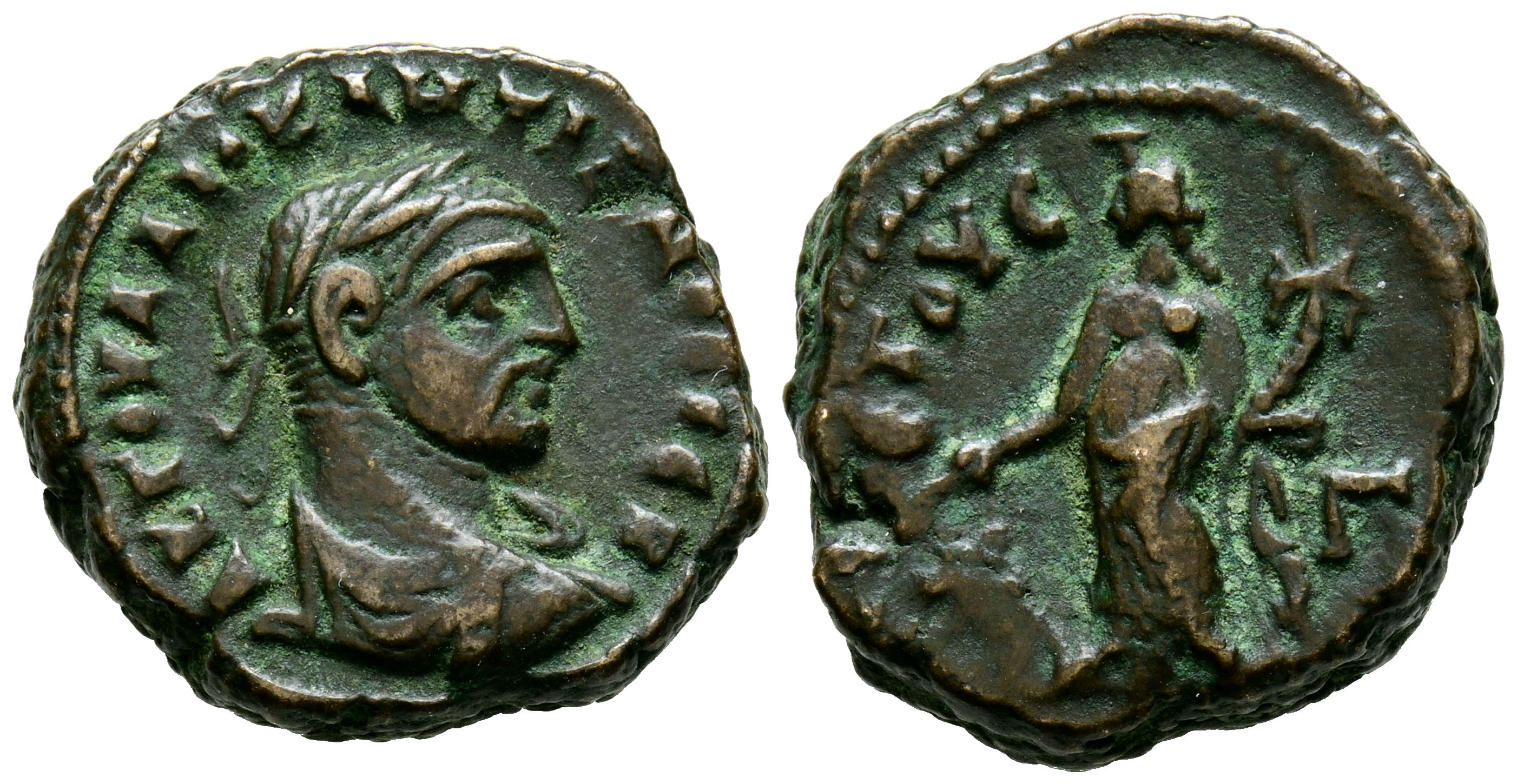 DIOCLECIANO. Tetradracma. (Ae. 8,82g/19mm). 285-286 d.C. Alejandria. (Spink 12855). Anv: Busto laureado y drapeado de Diocleciano a derecha, alrededor leyenda: A K ΓOYA DIOKLHTIANOC. Rev: Dikaiosyne estante a izquierda sosteniendo patera sobre modrio y cornucopia; en campo: r, al lado leyenda gruega. MBC